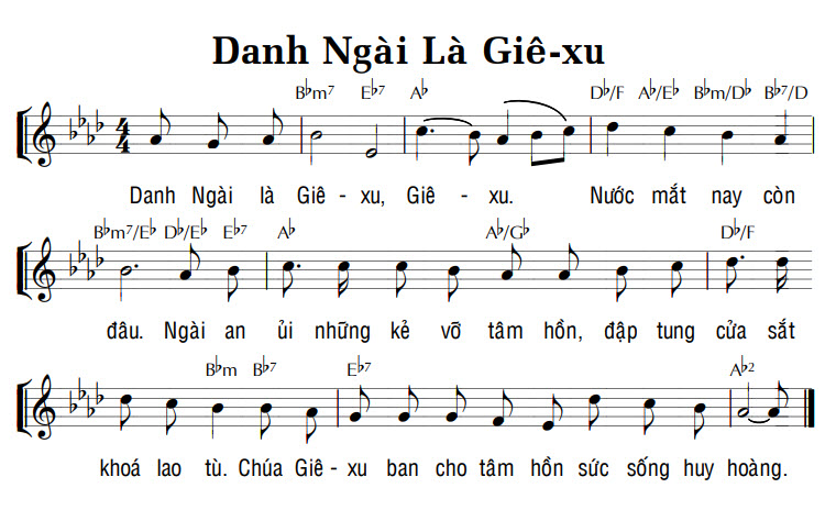 1. Danh Ngài là Giê-xu, Giê-xu. Nước mắt nay còn đâu. Ngài an ủi những kẻ vô tâm hồn, đập tung cửa sắt khoá lao tù. Chúa Giê-xu ban cho tâm hồn sức sống huy hoàng.
