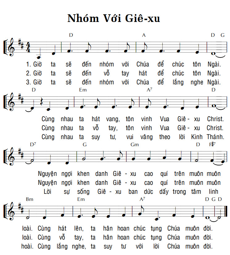 1. Giờ ta sẽ đến nhóm với Chúa để chúc tôn Ngài. Cùng nhau ta hát vang, tôn vinh Vua Giê-xu Christ. Nguyện ngợi khen danh Giê-xu cao quí trên muôn muôn loài. Cùng hát lên, ta hân hoan chúc tụng Chúa muôn đời. 2. Giờ ta sẽ đến vỗ tay hát để chúc tôn Ngài. Cùng nhau ta vỗ tay, tôn vinh Vua Giê-xu Christ. Nguyện ngợi khen danh Giê-xu cao quí trên muôn muôn loài. Cùng vỗ tay, ta hân hoan chúc tụng Chúa muôn đời. 3. Giờ ta sẽ đến nhóm với Chúa để lắng nghe Ngài. Cùng nhau ta suy tư, vui vâng theo lời Kinh Thánh. Lời sự sống Giê-xu ban đức dấy trong tâm linh hoài. Cùng lắng nghe, ta suy tư với lời Chúa muôn đời.