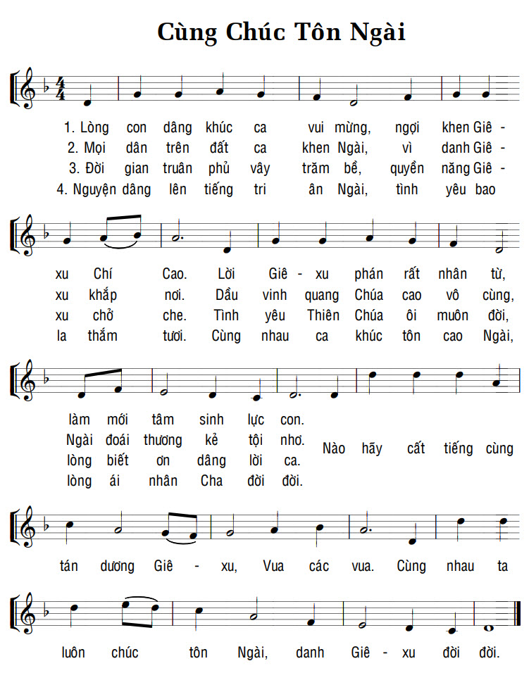 1. Lòng con dâng khúc ca vui mừng, ngợi khen Giê-xu Chí Cao. Lời Giê-xu phán rất nhân từ, làm mới tâm sinh lực con. tán dương Giê-xu, Vua các vua. Cùng nhau ta luôn chúc tôn Ngài, danh Giê-xu đời đời. 2. Mọi dân trên đất ca khen Ngài, vì danh Giê-xu khắp nơi. Dầu vinh quang Chúa cao vô cùng, Ngài đoái thương kẻ tội nhỏ. Nào hãy cất tiếng cùng luôn chúc tôn Ngài, danh Giê-xu đời đời. 3. Đời gian truân phủ vây trăm bề, quyền năng Giê-xu chở che. Tình yêu Thiên Chúa ôi muôn đời, lòng biết ơn dâng lời ca. luôn chúc tôn Ngài, danh Giê-xu đời đời. 4. Nguyện dâng lên tiếng tri ân Ngài, tình yêu bao la thắm tươi. Cùng nhau ca khúc tôn cao Ngài, lòng ái nhân Cha đời đời. luôn chúc tôn Ngài, danh Giê-xu đời đời.