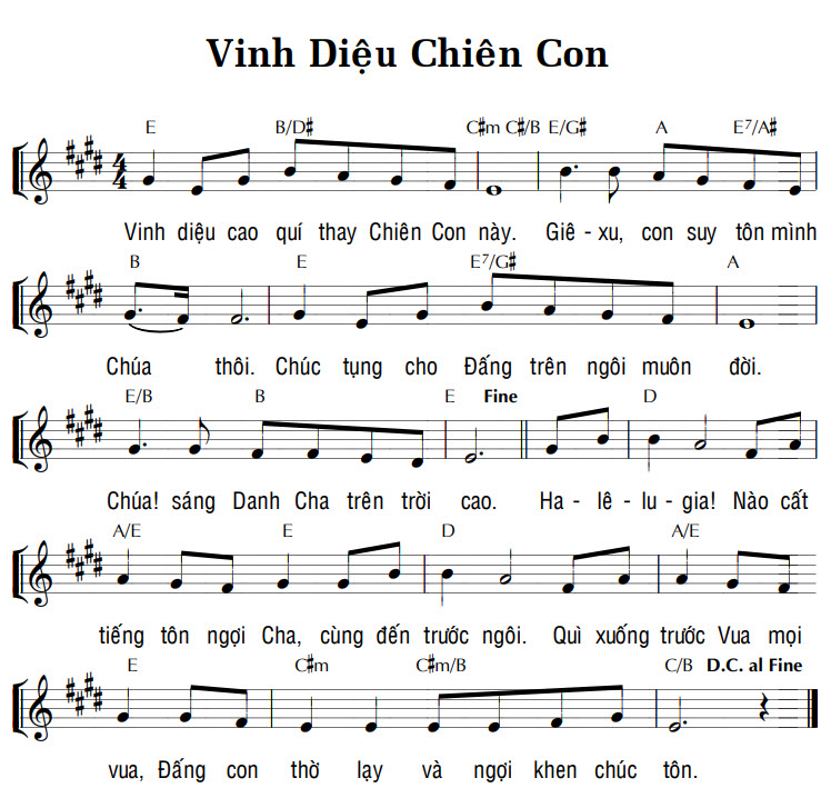 1. Vinh diệu cao quí thay Chiên Con này. Giê-xu, con suy tôn mình Chúa thôi. Chúc tụng cho Đấng trên ngôi muôn đời. Chúa! sáng Danh Cha trên trời cao. Ha-lê-lu-gia! Nào cất tiếng tôn ngợi Cha, cùng đến trước ngôi. Quì xuống trước Vua mọi vua, Đấng con thờ lạy và ngợi khen chúc tôn.