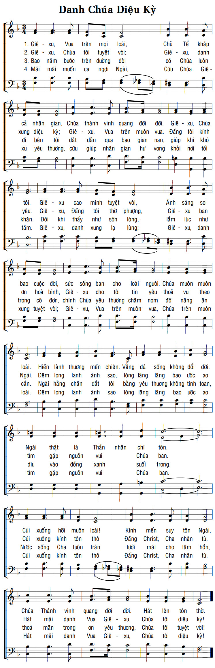 1. Giê-xu, Vua trên mọi loài, Chủ Tể khắp cả nhân gian, Chúa thánh vinh quang đời đời. Giê-xu cao minh tuyệt vời, Ánh sáng soi bao cuộc đời, sức sống ban cho loài người. Hiền lành thương mến chiên. Vầng đá sống không đổi dời. Ngài thật là Thần nhân chí tôn. Cúi xuống hỡi muôn loài! Kính mến suy tôn Ngài, Chúa Thánh vinh quang đời đời. Hát lên tôn thờ. 2. Giê-xu, Chúa tôi tuyệt vời; Giê-xu, danh xưng diệu kỳ; Giê-xu, Vua trên muôn vua. Đấng tôi kính yêu. Giê-xu, Đấng tôi thờ phượng, Giê-xu ban ơn hoà bình, Giê-xu cho tôi tin yêu thoả vui theo Ngài. Đêm long lanh ánh sao, lòng lâng lâng bao ước ao tìm gặp nguồn vui Chúa ban. Cúi xuống kính tôn thờ Đấng Christ, Cha nhân từ. Hát mãi danh Vua Giê-xu, Chúa tôi diệu kỳ! 3. Bao năm bước trên đường đời có Chúa luôn đi bên tôi dắt dẫn qua bao gian nan, giúp khi khó khăn. Đôi khi thấy như sờn lòng, lắm lúc như trong cô đơn, chính Chúa yêu thương chăm nom đỡ nâng ân cần. Ngài hằng chăn dắt tôi bằng yêu thương không tính toan, dìu vào đồng xanh suối trong. Nước sống Cha tuôn tràn tưới mát cho tâm hồn, thoả mãn trong ơn yêu thương, Chúa tôi tuyệt vời! 4. Mãi mãi muốn ca ngợi Ngài, Cứu Chúa Giê-xu yêu thương, cứu giúp nhân gian hư vong khỏi nơi tối tăm. Giê-xu, danh xưng lạ lùng; Giê-xu, danh xưng tuyệt vời; Giê-xu, Vua trên muôn vua, Chúa trên muôn loài. Đêm long lanh ánh sao lòng lâng lâng bao ước ao tìm gặp nguồn vui Chúa ban. Cúi xuống kính tôn thờ Đấng Christ, Cha nhân từ. Hát mãi danh Vua Giê-xu, Chúa tôi diệu kỳ!