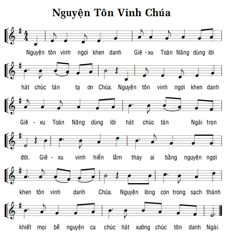 1. Nguyện tôn vinh ngợi khen danh Giê-xu Toàn Năng dùng lời hát chúc tán tạ ơn Chúa. Nguyện tôn vinh ngợi khen danh Giê-xu Toàn Năng dùng lời hát chúc tán Ngài trọn đời. Giê-xu vinh hiển lắm thay ai bằng nguyện ngợi khen tôn vinh danh Chúa. Nguyện lòng con trong sạch thánh khiết mọi bề nguyện ca chúc hát xướng chúc tôn danh Ngài.