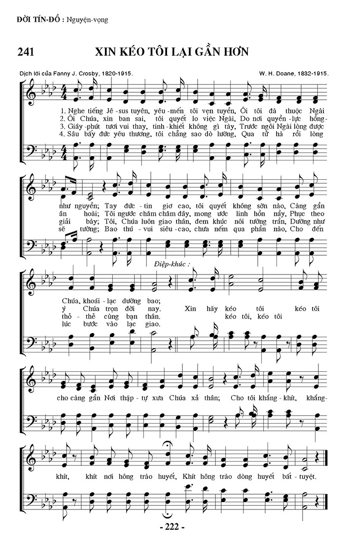 1. Nghe tiếng Jê-sus tuyên, yêu mến tôi vẹn tuyền, Ôi tôi đà thuộc Ngài như nguyền; Tay đức tin giơ cao, tôi quyết không sờn nào, Càng gần ân hoài; Tôi ngước chăm chăm đây, mong ước linh hồn nầy, Phục theo giải bày; Tôi, Chúa luôn giao thân, đem khúc nôi tường trần, Dường như sẽ tường; Bao thú vui siêu-cao, chưa nếm qua phần nào, Cho đến 2. Ôi Chúa, xin ban sai, tôi quyết lo việc Ngài, Do nơi quyền lực hồng-ân hoài; Tôi ngước chăm chăm đây, mong ước linh hồn nầy, Phục theo giải bày; Tôi, Chúa luôn giao thân, đem khúc nôi tường trần, Dường như sẽ tường; Bao thú vui siêu-cao, chưa nếm qua phần nào, Cho đến 3. Giây phút tươi vui thay, tinh khiết không gì tày, Trước ngôi Ngài lòng được ân hoài; Tôi ngước chăm chăm đây, mong ước linh hồn nầy, Phục theo giải bày; Tôi, Chúa luôn giao thân, đem khúc nôi tường trần, Dường như sẽ tường; Bao thú vui siêu-cao, chưa nếm qua phần nào, Cho đến 4. Sâu bấy đức yêu thương, tôi chẳng sao dò lường, Qua tử hà rồi lòng ân hoài; Tôi ngước chăm chăm đây, mong ước linh hồn nầy, Phục theo giải bày; Tôi, Chúa luôn giao thân, đem khúc nôi tường trần, Dường như sẽ tường; Bao thú vui siêu-cao, chưa nếm qua phần nào, Cho đến Điệp khúc: Chúa, khoái lạc dường bao; ý Chúa trọn đời nay. Xin hãy kéo tôi kéo tôi kéo tôi thỏ thẻ cùng bạn thân. lúc bước vào lạc giao. cho càng gần Nơi thập tự xưa Chúa xả thân; Cho tôi khắng khít, khắng- khít, khít nơi hông trào huyết, Khít hông trào dòng huyết bất tuyệt.