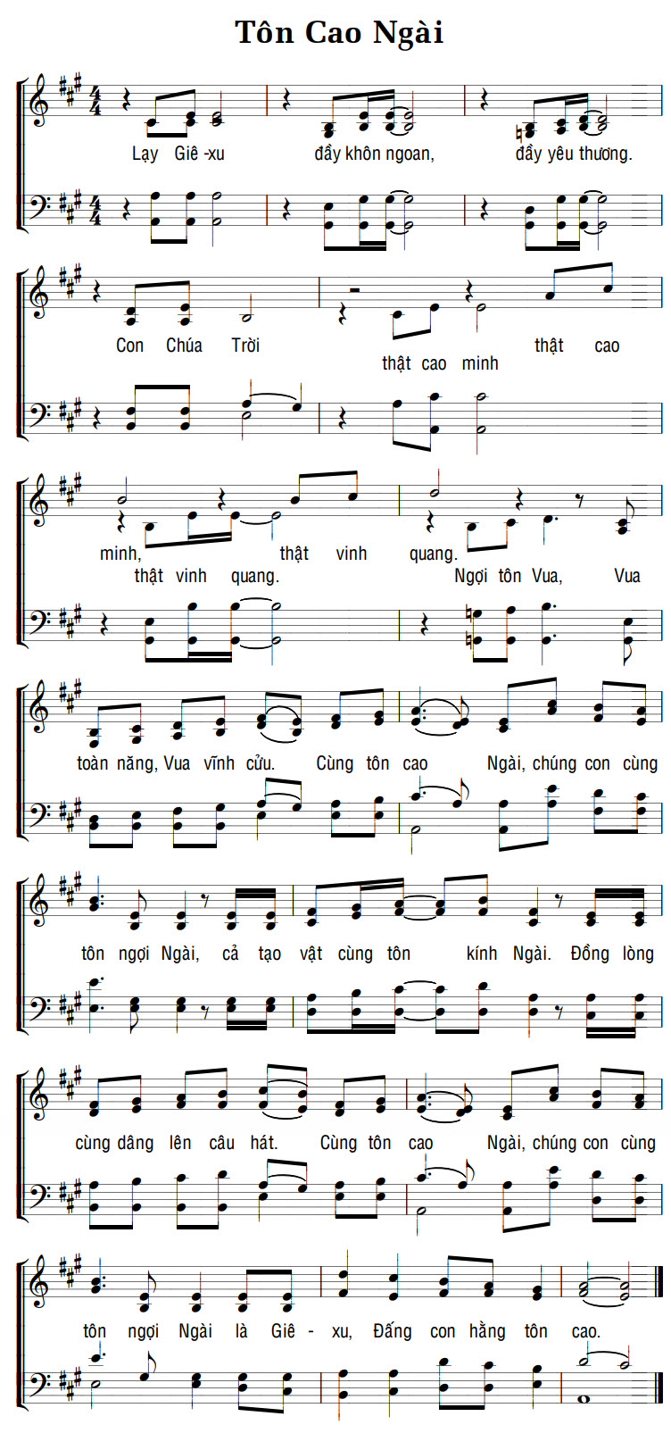 1. Lạy Giê-xu đầy khôn ngoan, đầy yêu thương. Con Chúa Trời thật cao minh, thật vinh quang. Ngợi tôn Vua, Vua toàn năng, Vua vĩnh cửu. Cùng tôn cao Ngài, chúng con cùng tôn ngợi Ngài, cả tạo vật cùng tôn kính Ngài. Đồng lòng cùng dâng lên câu hát. Cùng tôn cao Ngài, chúng con cùng tôn ngợi Ngài là Giê-xu, Đấng con hằng tôn cao.