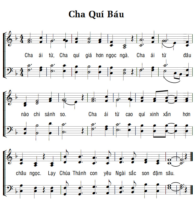 1. Cha ái từ, Cha quí giá hơn ngọc ngà. Cha ái từ đâu nào chi sánh so. Cha ái từ cao quí xinh xắn hơn châu ngọc. Lạy Chúa Thánh con yêu Ngài sắc son đậm sâu.