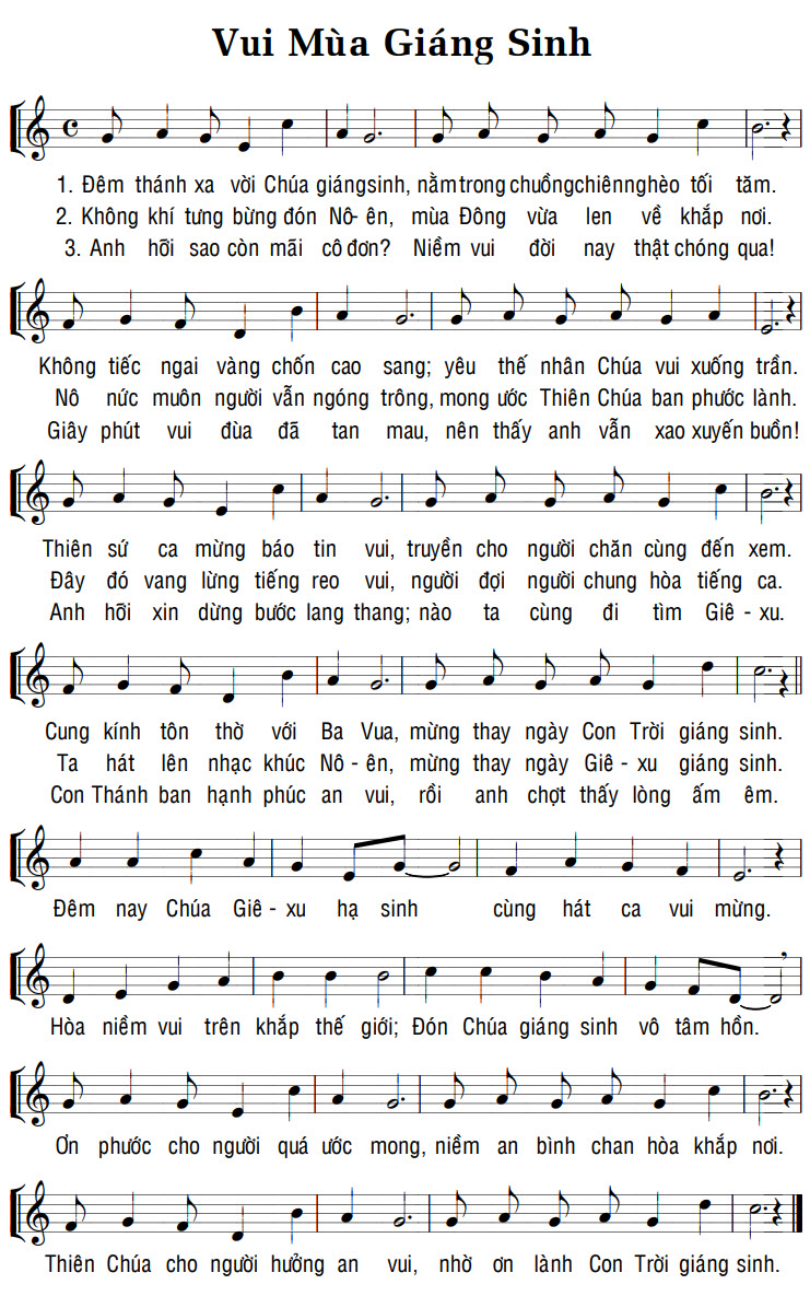 1. Đêm thánh xa vời Chúa giáng sinh, nằm trong chuồng chiên nghèo tối tăm. Không tiếc ngai vàng chốn cao sang; yêu thế nhân Chúa vui xuống trần. Thiên sứ ca mừng báo tin vui, truyền cho người chăn cùng đến xem. Cung kính tôn thờ với Ba Vua, mừng thay ngày Con Trời giáng sinh. Đêm nay Chúa Giê-xu hạ sinh cùng hát ca vui mừng. Hòa niềm vui trên khắp thế giới; Đón Chúa giáng sinh vô tâm hồn. Ơn phước cho người quá ước mong, niềm an bình chan hòa khắp nơi. Thiên Chúa cho người hưởng an vui, nhờ ơn lành Con Trời giáng sinh. 2. Không khí tưng bừng đón Nô-ên, mùa Đông vừa len về khắp nơi. Nô nức muôn người vẫn ngóng trông, mong ước Thiên Chúa ban phước lành. Đây đó vang lừng tiếng reo vui, người đợi người chung hòa tiếng ca. Ta hát lên nhạc khúc Nô-ên, mừng thay ngày Giê-xu giáng sinh. Đêm nay Chúa Giê-xu hạ sinh cùng hát ca vui mừng. Hòa niềm vui trên khắp thế giới; Đón Chúa giáng sinh vô tâm hồn. Ơn phước cho người quá ước mong, niềm an bình chan hòa khắp nơi. Thiên Chúa cho người hưởng an vui, nhờ ơn lành Con Trời giáng sinh. 3. Anh hỡi sao còn mãi cô đơn? Niềm vui đời nay thật chóng qua! Giây phút vui đùa đã tan mau, nên thấy anh vẫn xao xuyến buồn! Anh hối xin dừng bước lang thang; nào ta cùng đi tìm Giê-xu. Con Thánh ban hạnh phúc an vui, rồi anh chợt thấy lòng ấm êm. Đêm nay Chúa Giê-xu hạ sinh cùng hát ca vui mừng. Hòa niềm vui trên khắp thế giới; Đón Chúa giáng sinh vô tâm hồn. Ơn phước cho người quá ước mong, niềm an bình chan hòa khắp nơi. Thiên Chúa cho người hưởng an vui, nhờ ơn lành Con Trời giáng sinh.