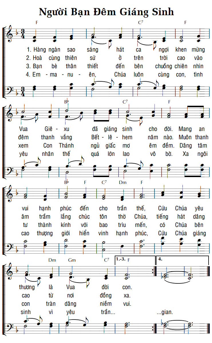 1. Hàng ngàn sao sáng hát ca ngợi khen mừng Vua Giê-xu đã giáng sinh cho đời. Mang an vui hạnh phúc đến cho trần thế, Cứu Chúa yêu thương là Vua đời con. 2. Hoà cùng thiên sứ ở trên trời cao vào đêm thanh vắng Bết-lê-hem năm nào. Muôn thanh âm trầm lắng chúc tôn thờ Chúa, tiếng hát dâng cao từ nơi đồng xa. 3. Bạn bè thân thiết đến bên chuồng chiên nhìn xem Con Thánh ngủ giấc mơ êm đềm. Dâng tâm tư thành kính với bao trìu mến, có Chúa bên con tràn dâng niềm vui. 4. Em-ma-nu-ên, Chúa luôn cùng con, tình yêu nhân thế quá lớn lao vô bờ. Xa ngôi cao thượng giới hiển vinh hạnh phúc, Cứu Chúa giáng sinh vì yêu trần... gian.