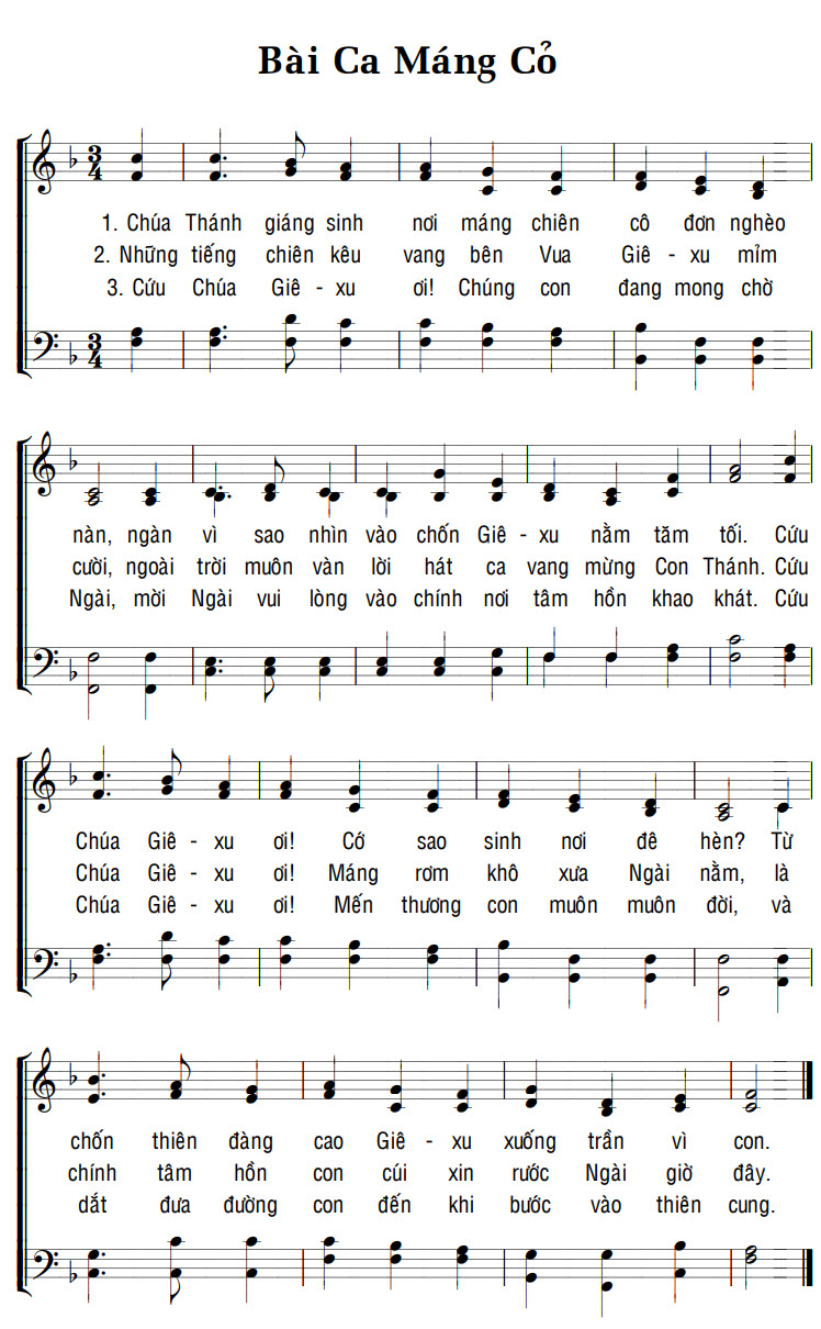 1. Chúa Thánh giáng sinh nơi máng chiên cô đơn nghèo nàn, ngàn vì sao nhìn vào chốn Giê-xu nằm tăm tối. Cứu Chúa Giê-xu ơi! Có sao sinh nơi đê hèn? Từ chốn thiên đàng cao Giê-xu xuống trần vì con. 2. Những tiếng chiên kêu vang bên Vua Giê-xu mỉm cười, ngoài trời muôn vàn lời hát ca vang mừng Con Thánh. Cứu Chúa Giê-xu ơi! Máng rơm khô xưa Ngài nằm, là chính tâm hồn con cúi xin rước Ngài giờ đây. 3. Cứu Chúa Giê-xu ơi! Chúng con đang mong chờ Ngài, mời Ngài vui lòng vào chính nơi tâm hồn khao khát. Cứu Chúa Giê-xu ơi! Mến thương con muôn muôn đời, và dắt đưa đường con đến khi bước vào thiên cung.