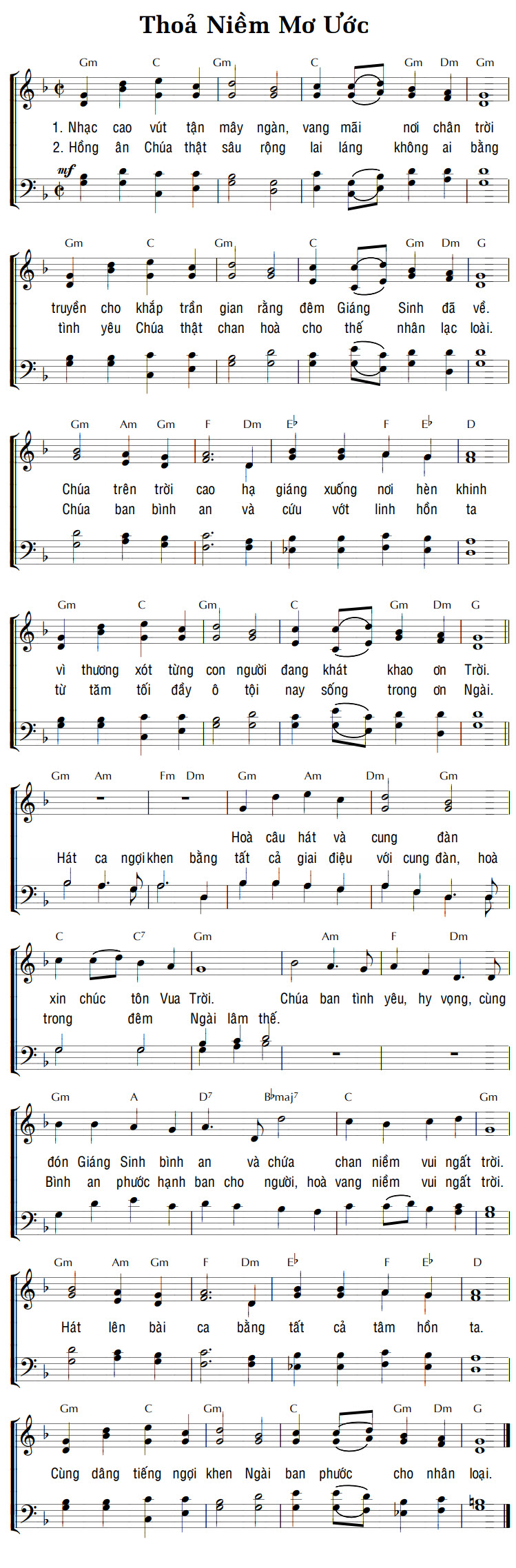 1. Nhạc cao vút tận mây ngàn, vang mãi nơi chân trời truyền cho khắp trần gian rằng đêm Giáng Sinh đã về. Chúa trên trời cao hạ giáng xuống nơi hèn khinh vì thương xót từng con người đang khát khao ơn Trời. Hát ca ngợi khen bằng tất cả giai điệu với cung đàn, hoà xin chúc tôn Vua Trời. đón Giáng Sinh bình an và chứa chan niềm vui ngất trời. Hát lên bài ca bằng tất cả tâm hồn ta. Cùng dâng tiếng ngợi khen Ngài ban phước cho nhân loại. 2. Hồng ân Chúa thật sâu rộng lai láng không ai bằng tình yêu Chúa thật chan hoà cho thế nhân lạc loài. Chúa ban bình an và cứu vớt linh hồn ta từ tăm tối đầy ô tội nay sống trong ơn Ngài. Hoà câu hát và cung đàn trong đêm Ngài lâm thế. Bình an phước hạnh ban cho người, hoà vang niềm vui ngất trời.