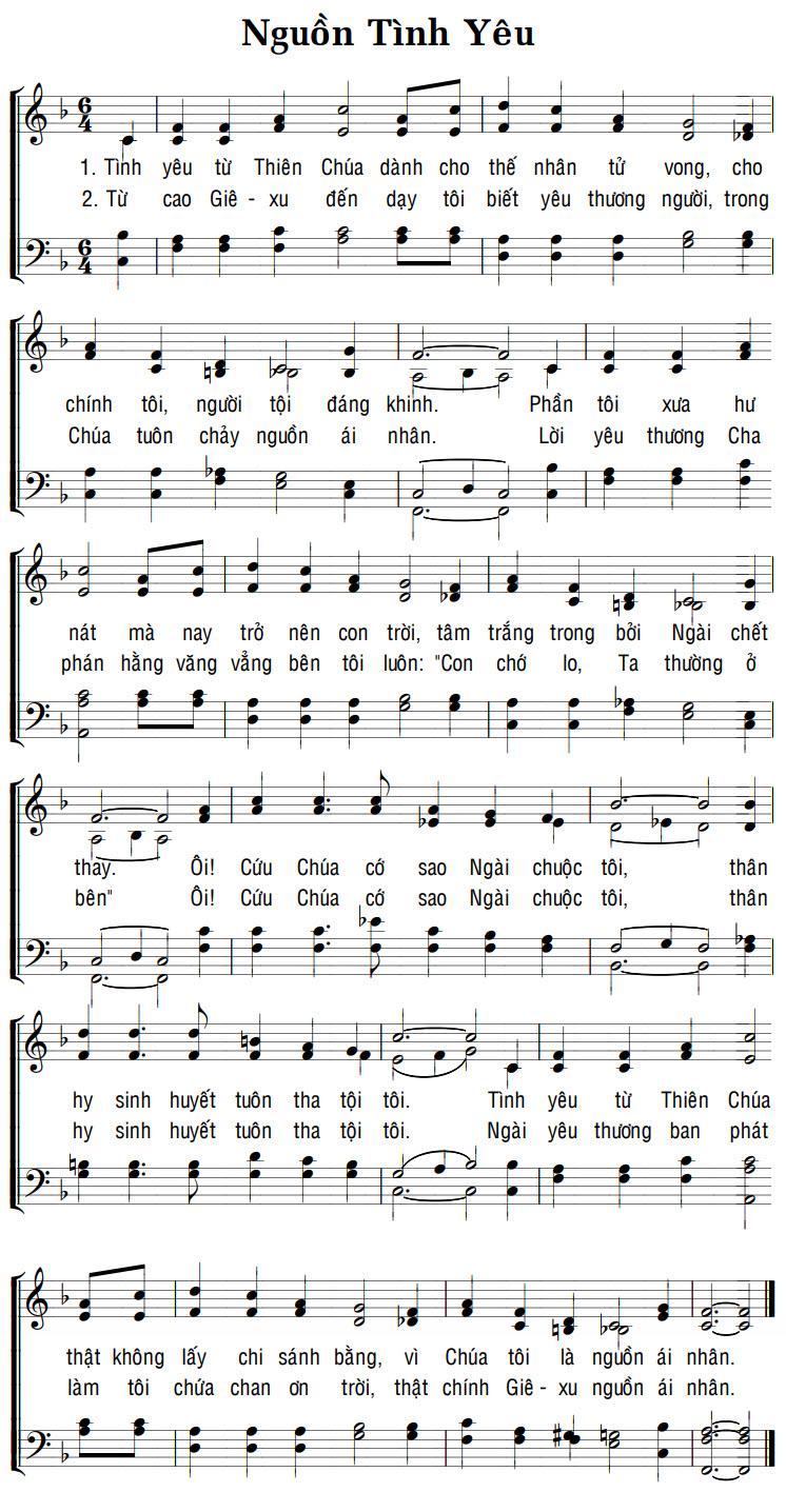 1. Tình yêu từ Thiên Chúa dành cho thế nhân tử vong, cho chính tôi, người tội đáng khinh. Phần tôi xưa hư nát mà nay trở nên con trời, tâm trắng trong bởi Ngài chết thay. Ôi! Cứu Chúa có sao Ngài chuộc tôi, thân hy sinh huyết tuôn tha tội tôi. Tình yêu từ Thiên Chúa thật không lấy chi sánh bằng, vì Chúa tôi là nguồn ái nhân. 2. Từ cao Giê-xu đến dạy tôi biết yêu thương người, trong Chúa tuôn chảy nguồn ái nhân. Lời yêu thương Cha phán hằng văng vẳng bên tôi luôn: "Con chớ lo, Ta thường ở bên" Ôi! Cứu Chúa có sao Ngài chuộc tôi, thân hy sinh huyết tuôn tha tội tôi. Ngài yêu thương ban phát làm tôi chứa chan ơn trời, thật chính Giê-xu nguồn ái nhân.