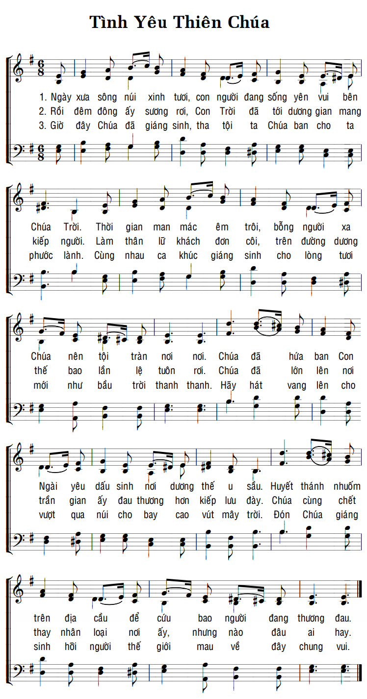 1. Ngày xưa sông núi xinh tươi, con người đang sống yên vui bên Chúa Trời. Thời gian man mác êm trôi, bỗng người xa Chúa nên tội tràn nơi nơi. Chúa đã hứa ban Con Ngài yêu dấu sinh nơi dương thế u sầu. Huyết thánh nhuốm trên địa cầu để cứu bao người đang thương đau. 2. Rồi đêm đông ấy sương rơi, Con Trời đã tới dương gian mang kiếp người. Làm thân lữ khách đơn côi, trên đường dương thế bao lần lệ tuôn rơi. Chúa đã lớn lên nơi trần gian ấy đau thương hơn kiếp lưu đày. Chúa cùng chết thay nhân loại nơi ấy, nhưng nào đâu ai hay. 3. Giờ đây Chúa đã giáng sinh, tha tội ta Chúa ban cho ta phước lành. Cùng nhau ca khúc giáng sinh cho lòng tươi mới như bầu trời thanh thanh. Hãy hát vang lên cho vượt qua núi cho bay cao vút mây trời. Đón Chúa giáng sinh hỡi người thế giới mau về đây chung vui.