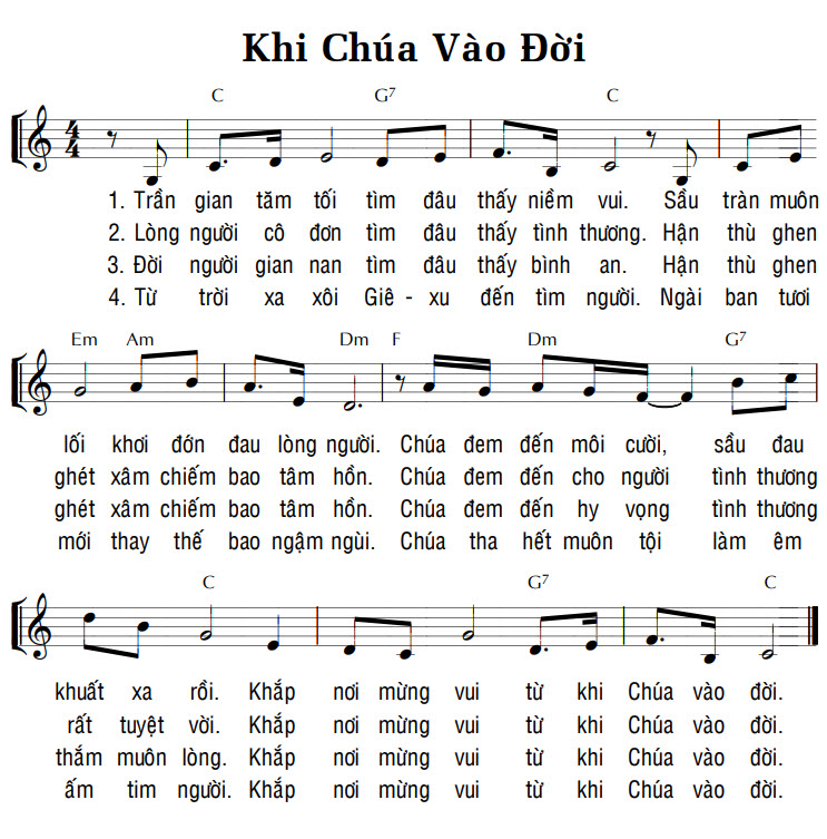 1. Trần gian tăm tối tìm đâu thấy niềm vui. Sầu tràn muôn lối khơi đớn đau lòng người. Chúa đem đến môi cười, sầu đau khuất xa rồi. Khắp nơi mừng vui từ khi Chúa vào đời. 2. Lòng người cô đơn tìm đâu thấy tình thương. Hận thù ghen ghét xâm chiếm bao tâm hồn. Chúa đem đến cho người tình thương rất tuyệt vời. Khắp nơi mừng vui từ khi Chúa vào đời. 3. Đời người gian nan tìm đâu thấy bình an. Hận thù ghen ghét xâm chiếm bao tâm hồn. Chúa đem đến hy vọng tình thương thắm muôn lòng. Khắp nơi mừng vui từ khi Chúa vào đời. 4. Từ trời xa xôi Giê-xu đến tìm người. Ngài ban tươi mới thay thế bao ngậm ngùi. Chúa tha hết muôn tội làm êm ấm tim người. Khắp nơi mừng vui từ khi Chúa vào đời.