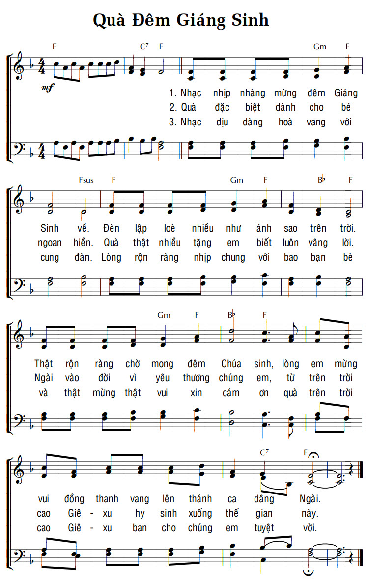 1. Nhạc nhịp nhàng mừng đêm Giáng Sinh về. Đèn lập loè nhiều như ánh sao trên trời. Thật rộn ràng chờ mong đêm Chúa sinh, lòng em mừng vui đồng thanh vang lên thánh ca dâng Ngài. 2. Quà đặc biệt dành cho bé ngoan hiền. Quà thật nhiều tặng em biết luôn vâng lời. Ngài vào đời vì yêu thương chúng em, từ trên trời cao Giê-xu hy sinh xuống thế gian này. 3. Nhạc dịu dàng hoà vang với cung đàn. Lòng rộn ràng nhịp chung với bao bạn bè và thật mừng thật vui xin cám ơn quà trên trời cao Giê-xu ban cho chúng em tuyệt vời.