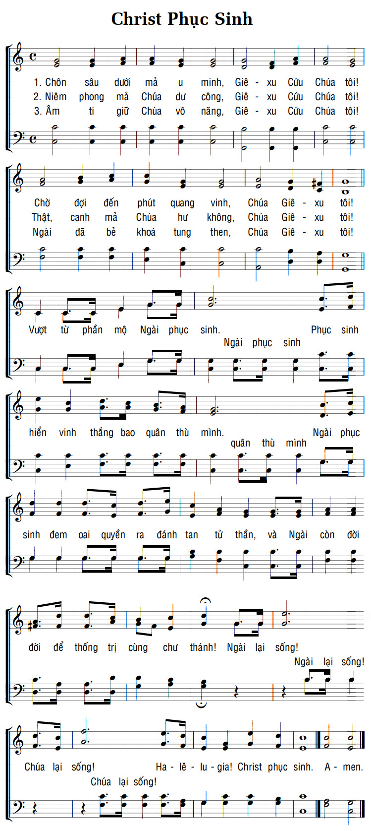 1. Chôn sâu dưới mả u minh, Giê-xu Cứu Chúa tôi! Chờ đợi đến phút quang vinh, Chúa Giê-xu tôi! Vượt từ phần mộ Ngài phục sinh. hiển vinh thắng bao quân thù mình. sinh đem oai quyền ra đánh tan tử thần, và Ngài còn đời đời để thống trị cùng chư thánh! 2. Niêm phong mả Chúa dư công, Giê-xu Cứu Chúa tôi! Thật, canh mả Chúa hư không, Chúa Giê-xu tôi! Vượt từ phần mộ Ngài phục sinh. hiển vinh thắng bao quân thù mình. sinh đem oai quyền ra đánh tan tử thần, và Ngài còn đời đời để thống trị cùng chư thánh! 3. Âm ti giữ Chúa vô năng, Giê-xu Cứu Chúa tôi! Ngài đã bẻ khoá tung then, Chúa Giê-xu tôi! Vượt từ phần mộ Ngài phục sinh. hiển vinh thắng bao quân thù mình. sinh đem oai quyền ra đánh tan tử thần, và Ngài còn đời đời để thống trị cùng chư thánh! Điệp khúc: Ngài phục sinh Ngài phục sinh quân thù mình Ngài lại sống! Ngài lại sống! Chúa lại sống! Ha-lê-lu-gia! Christ phục sinh. A-men. Chúa lại sống!