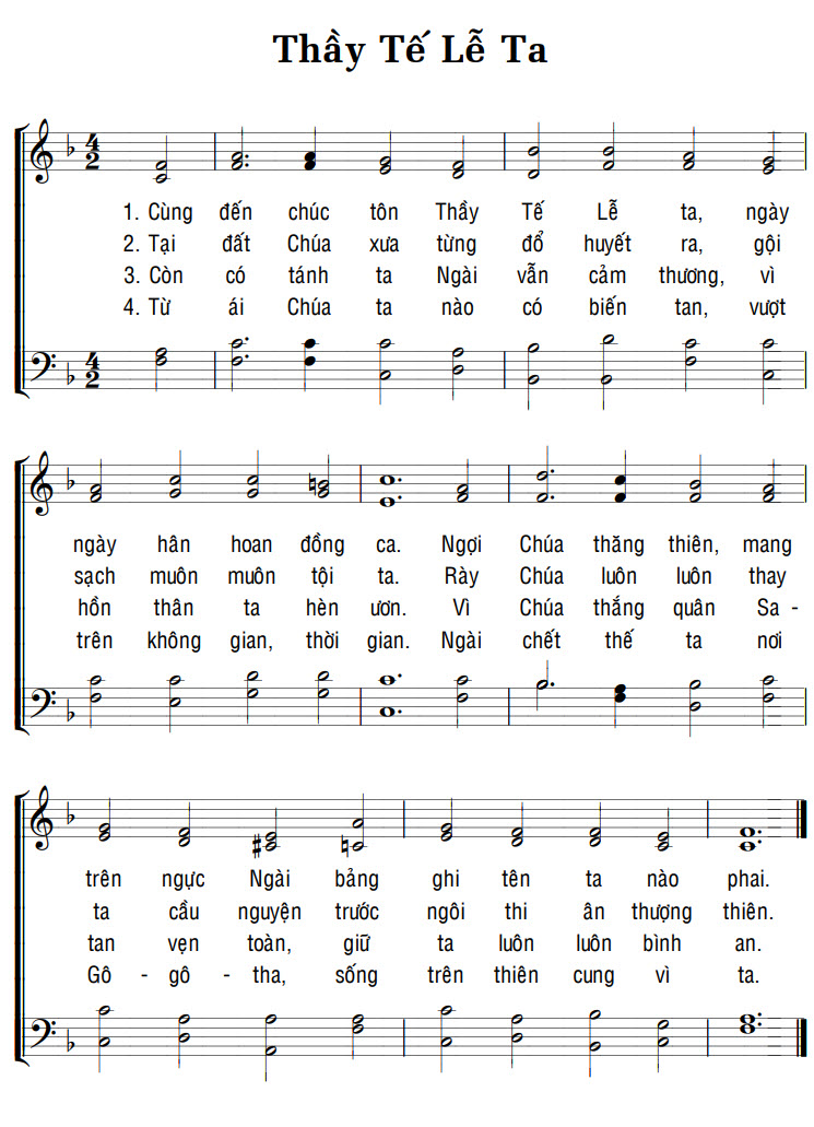 1. Cùng đến chúc tôn Thầy Tế Lễ ta, ngày ngày hân hoan đồng ca. Ngợi Chúa thăng thiên, mang trên ngực Ngài bảng ghi tên ta nào phai. 2. Tại đất Chúa xưa từng đổ huyết ra, gội sạch muôn muôn tội ta. Rày Chúa luôn luôn thay ta cầu nguyện trước ngôi thi ân thượng thiên. 3. Còn có tánh ta Ngài vẫn cảm thương, vì hồn thân ta hèn uơn. Vì Chúa thắng quân Sa-tan vẹn toàn, giữ ta luôn luôn bình an. 4. Từ ái Chúa ta nào có biến tan, vượt trên không gian, thời gian. Ngài chết thế ta nơi Gô-gô-tha, sống trên thiên cung vì ta.