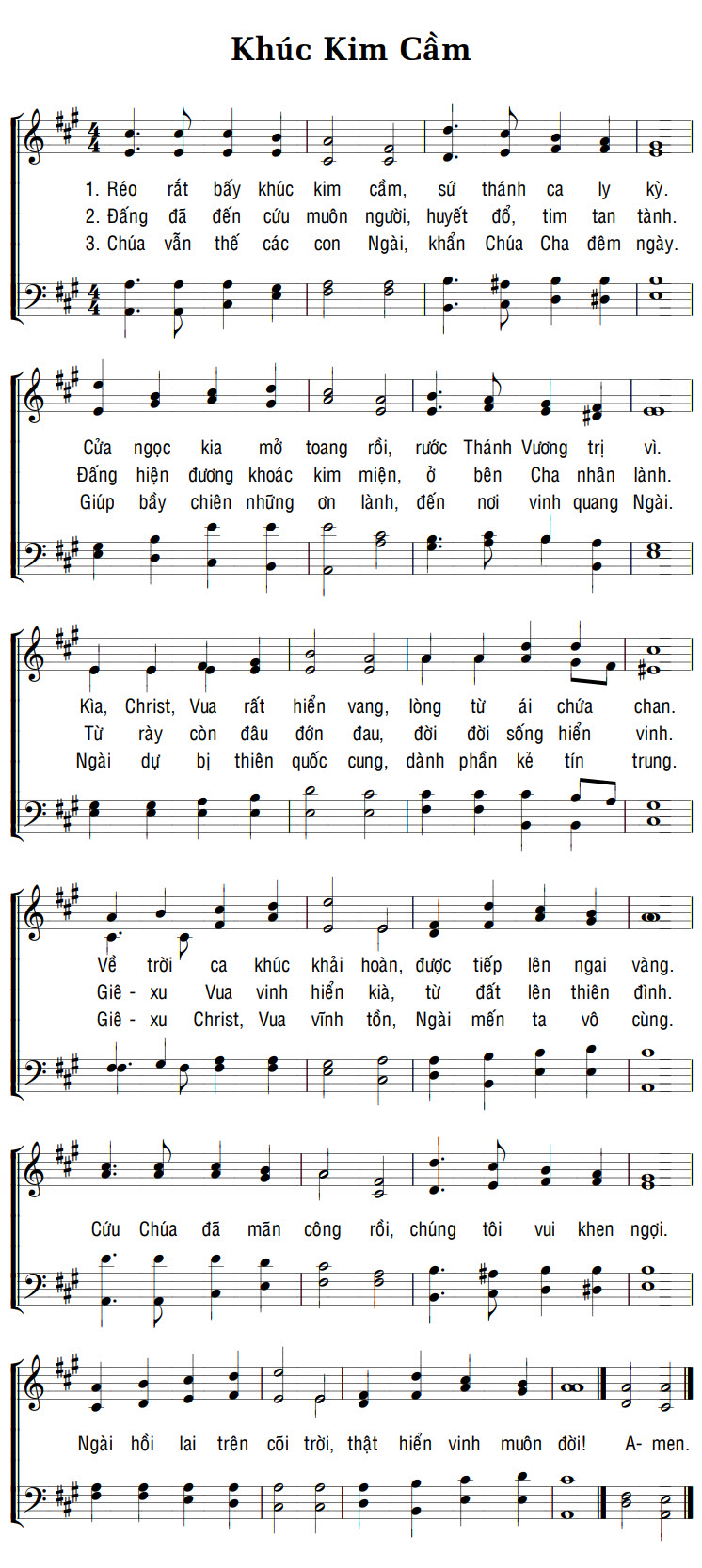 1. Réo rắt bấy khúc kim cầm, sứ thánh ca ly kỳ. Cửa ngọc kia mở toang rồi, rước Thánh Vương trị vì. Kia, Christ, Vua rất hiển vang, lòng từ ái chứa chan. Về trời ca khúc khải hoàn, được tiếp lên ngai vàng. Cứu Chúa đã mãn công rồi, chúng tôi vui khen ngợi. Ngài hồi lại trên cõi trời, thật hiển vinh muôn đời! A- men. 2. Đấng đã đến cứu muôn người, huyết đổ, tim tan tành. Đấng hiện đương khoác kim miện, ở bên Cha nhân lành. Từ rày còn đâu đớn đau, đời đời sống hiển vinh. Giê-xu Vua vinh hiển kìa, từ đất lên thiên đình. Cứu Chúa đã mãn công rồi, chúng tôi vui khen ngợi. Ngài hồi lại trên cõi trời, thật hiển vinh muôn đời! A- men. 3. Chúa vẫn thế các con Ngài, khẩn Chúa Cha đêm ngày. Giúp bầy chiên những ơn lành, đến nơi vinh quang Ngài. Ngài dự bị thiên quốc cung, dành phần kẻ tín trung. Giê-xu Christ, Vua vĩnh tồn, Ngài mến ta vô cùng. Cứu Chúa đã mãn công rồi, chúng tôi vui khen ngợi. Ngài hồi lại trên cõi trời, thật hiển vinh muôn đời! A- men.