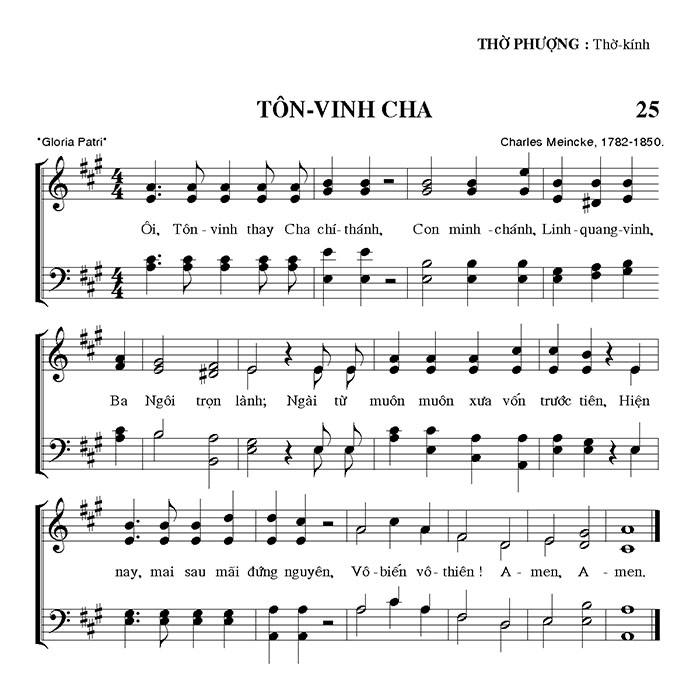 1. Ôi, Tôn - vinh thay Cha chí-thánh, Con minh -chánh, Linh-quang-vinh, Ba Ngôi trọn lành; Ngài từ muôn muốn xưa vốn trước tiên, Hiện nay, mai sau mãi đứng nguyên, Vô-biến vô-thiên! A - men, A - men.
