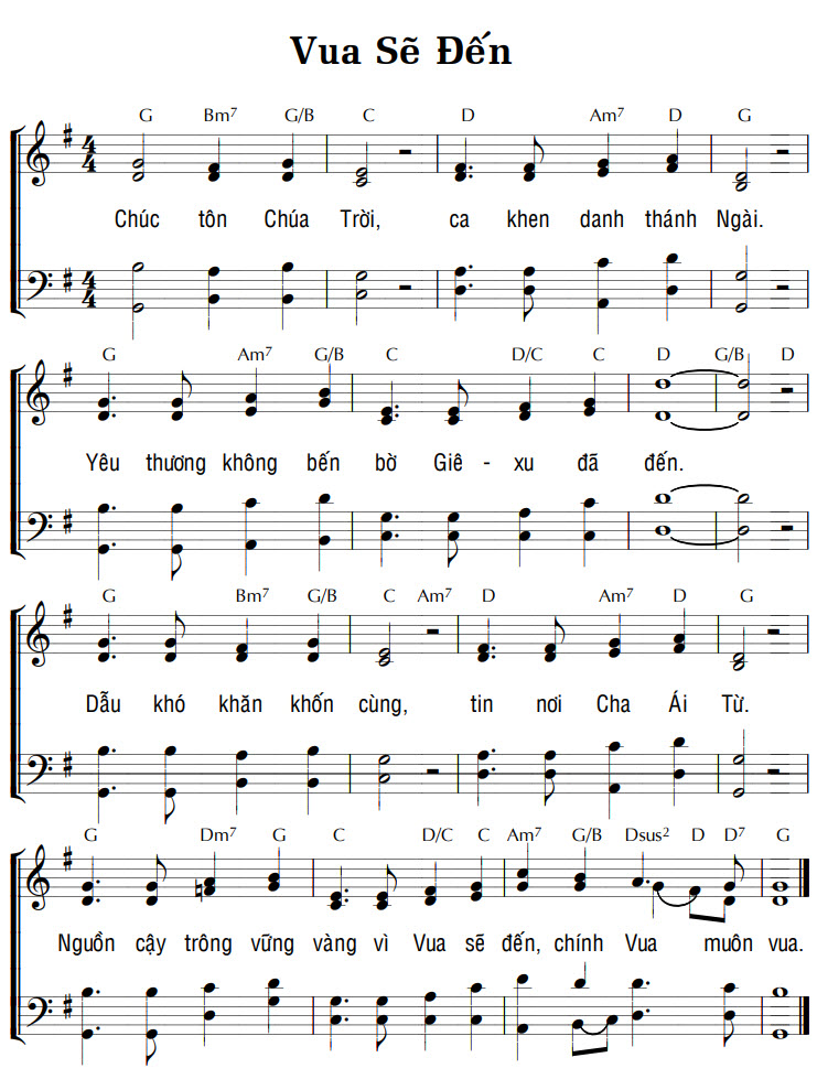 1. Chúc tôn Chúa Trời, ca khen danh thánh Ngài. Yêu thương không bến bờ Giê-xu đã đến. Dẫu khó khăn khốn cùng, tin nơi Cha Ái Từ. Nguồn cậy trông vững vàng vì Vua sẽ đến, chính Vua muôn vua.