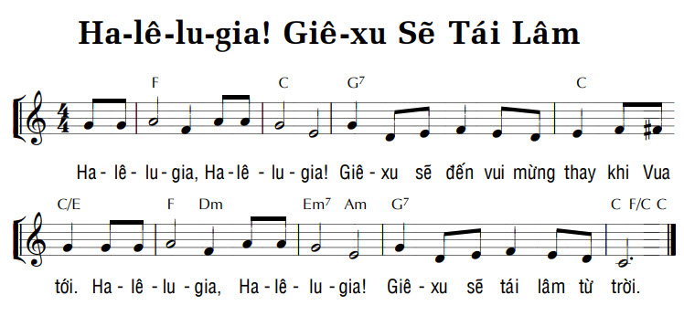 1. Ha-lê-lu-gia, Ha-lê-lu-gia! Giê-xu sẽ đến vui mừng thay khi Vua tới. Ha-lê-lu-gia, Ha-lê-lu-gia! Giê-xu sẽ tái lâm từ trời.