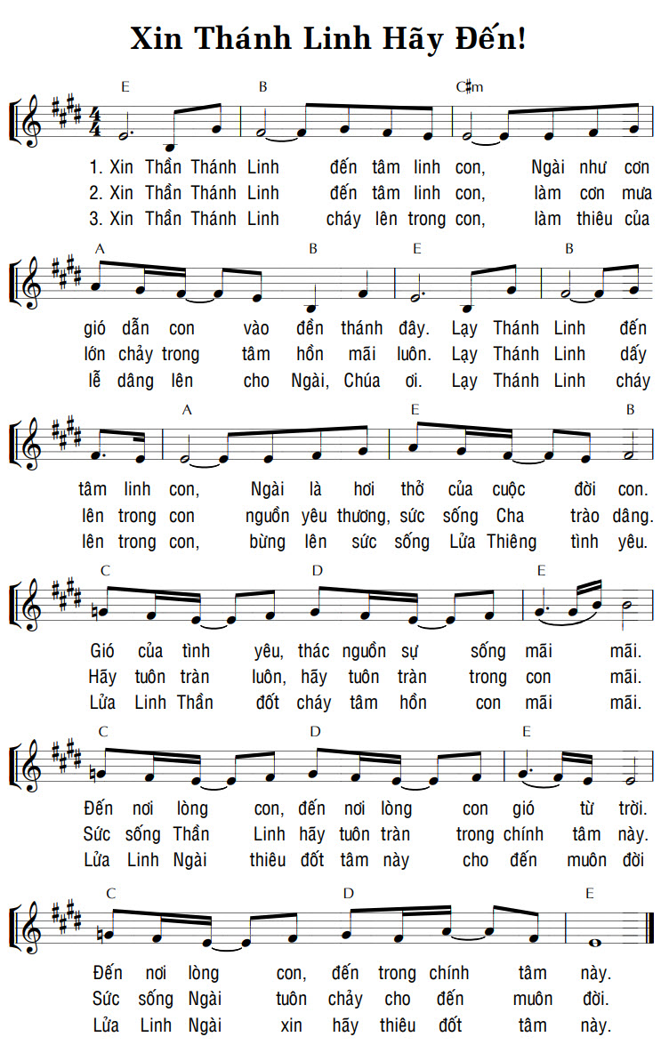 1. Xin Thần Thánh Linh đến tâm linh con, Ngài như cơn gió dẫn con vào đền thánh đây. Lạy Thánh Linh đến tâm linh con, Ngài là hơi thở của cuộc đời con. Gió của tình yêu, thác nguồn sự sống mãi mãi. Đến nơi lòng con, đến nơi lòng con gió từ trời. Đến nơi lòng con, đến trong chính tâm này. 2. Xin Thần Thánh Linh đến tâm linh con, làm cơn mưa lớn chảy trong tâm hồn mãi luôn. Lạy Thánh Linh dấy lên trong con nguồn yêu thương, sức sống Cha trào dâng. Hãy tuôn tràn luôn, hãy tuôn tràn trong con mãi mãi. Sức sống Thần Linh hãy tuôn tràn trong chính tâm này. Sức sống Ngài tuôn chảy cho đến muôn đời. 3. Xin Thần Thánh Linh cháy lên trong con, làm thiêu của lễ dâng lên cho Ngài, Chúa ơi. Lạy Thánh Linh cháy lên trong con, bừng lên sức sống Lửa Thiêng tình yêu. Lửa Linh Thần đốt cháy tâm hồn con mãi mãi. Lửa Linh Ngài thiêu đốt tâm này cho đến muôn đời. Lửa Linh Ngài xin hãy thiêu đốt tâm này.