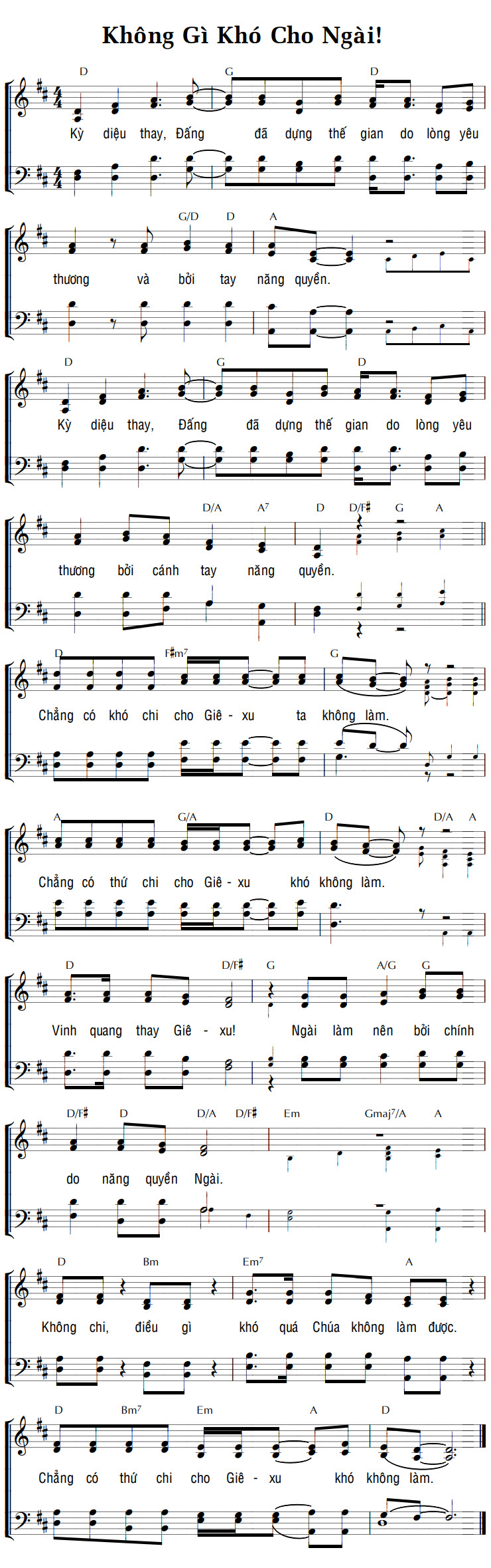 1. Kỳ diệu thay, Đấng đã dựng thế gian do lòng yêu thương và bởi tay năng quyền. 2. Kỳ diệu thay, Đấng đã dựng thế gian do lòng yêu thương bởi cánh tay năng quyền. Điệp khúc: Chẳng có khó chi cho Giê-xu ta không làm. Chẳng có thứ chi cho Giê-xu khó không làm. Vinh quang thay Giê-xu! Ngài làm nên bởi chính do năng quyền Ngài. Không chi, điều gì khó quá Chúa không làm được. Chẳng có thứ chi cho Giê-xu khó không làm.
