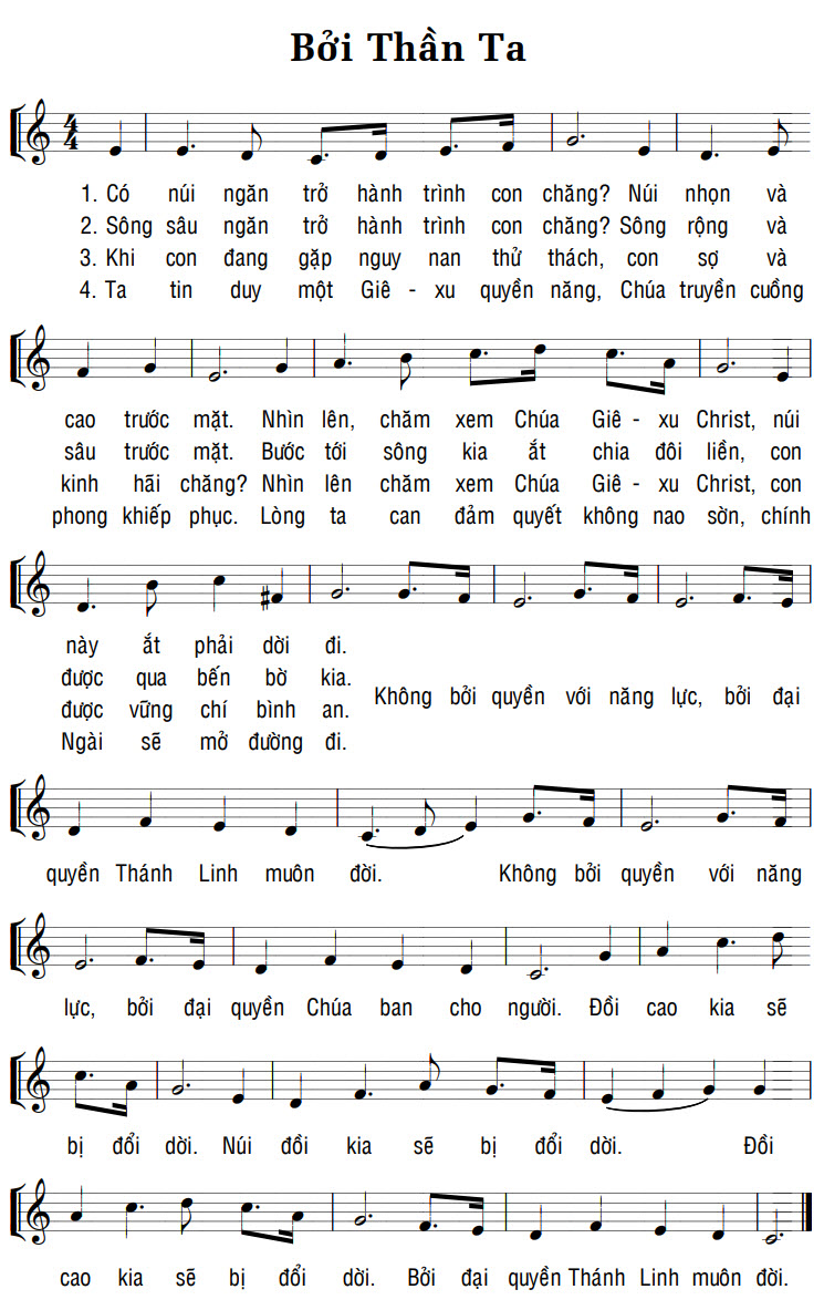 1. Có núi ngăn trở hành trình con chăng? Núi nhọn và cao trước mặt. Nhìn lên, chăm xem Chúa Giê-xu Christ, núi này ắt phải dời đi. 2. Sông sâu ngăn trở hành trình con chăng? Sông rộng và sâu trước mặt. Bước tới sông kia ắt chia đôi liền, con được qua bến bờ kia. 3. Khi con đang gặp nguy nan thử thách, con sợ và kinh hãi chăng? Nhìn lên chăm xem Chúa Giê-xu Christ, con được vững chí bình an. 4. Ta tin duy một Giê-xu quyền năng, Chúa truyền cuồng phong khiếp phục. Lòng ta can đảm quyết không nao sờn, chính Ngài sẽ mở đường đi. Điệp khúc: Không bởi quyền với năng lực, bởi đại quyền Thánh Linh muôn đời. Không bởi quyền với năng lực, bởi đại quyền Chúa ban cho người. Đồi cao kia sẽ bị đổi dời. Núi đồi kia sẽ bị đổi dời. Đồi cao kia sẽ bị đổi dời. Bởi đại quyền Thánh Linh muôn đời.