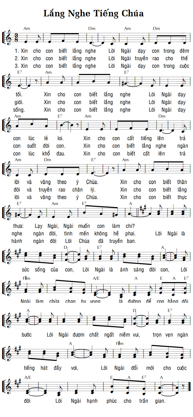 1. Xin cho con biết lắng nghe Lời Ngài dạy con trong đêm tối. Xin cho con biết lắng nghe Lời Ngài dạy con lúc lẻ loi. Xin cho con biết thân lời và vâng theo ý Chúa. Xin cho con biết thân thưa: Lạy Ngài, Ngài muốn con làm chi? 2. Xin cho con biết lắng nghe Lời Ngài truyền rao cho thế giới. Xin cho con biết lắng nghe Lời Ngài dạy con suốt đời con. Xin cho con biết lắng nghe ngàn đời và truyền rao chân lý. Xin cho con biết lắng nghe ngàn đời, tình mến không hề phai. 3. Xin cho con biết lắng nghe Lời Ngài dạy con trong cuộc sống. Xin cho con biết lắng nghe Lời Ngài dạy con lúc khổ đau. Xin cho con biết cất lên trả lời và vâng theo ý Chúa. Xin cho con biết thực hành ngàn đời Lời Chúa đã truyền ban. Điệp khúc: Lời Ngài là sức sống của con, Lời Ngài là ánh sáng đời con, Lời Ngài làm chứa chan hy vọng là đường để con hằng dõi bước Lời Ngài đượm chất ngất niềm vui, trọn vẹn ngàn tiếng hát đầy vơi, Lời Ngài đổi mới cho cuộc đời Lời Ngài hạnh phúc cho trần gian.