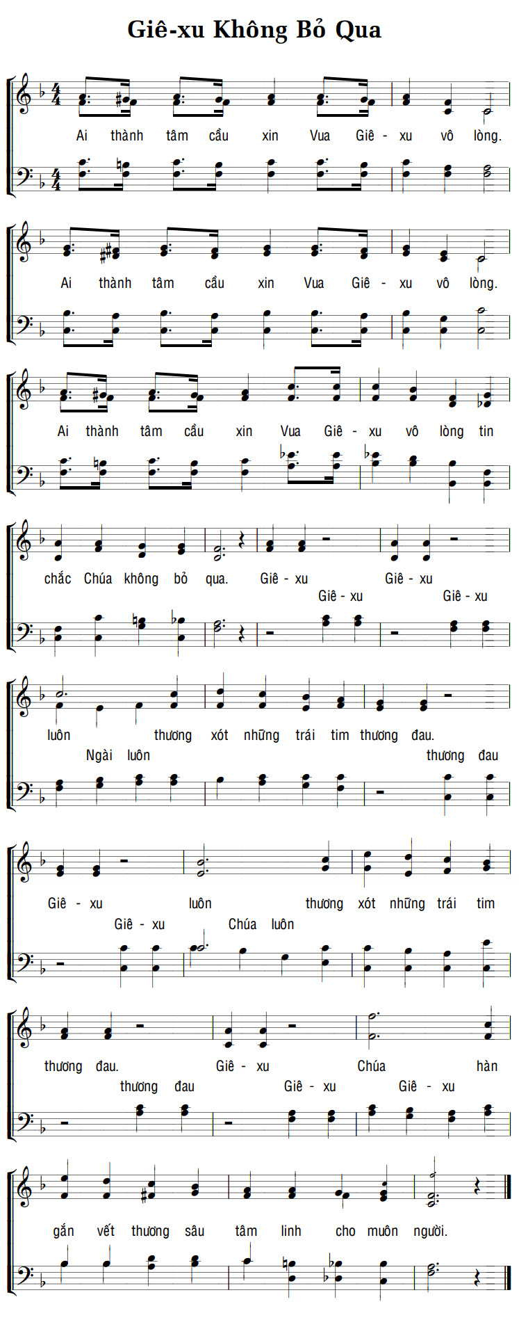 1. Ai thành tâm cầu xin Vua Giê-xu vô lòng. Ai thành tâm cầu xin Vua Giê-xu vô lòng. Ai thành tâm cầu xin Vua Giê-xu vô lòng tin chắc Chúa không bỏ qua. Điệp khúc: Giê-xu Giê-xu Giê-xu Giê-xu luôn thương xót những trái tim thương đau. Ngài luôn thương đau. Giê-xu luôn thương xót những trái tim thương đau. Chúa luôn thương đau. Giê-xu Giê-xu Giê-xu Giê-xu Chúa hàn gắn vết thương sâu tâm linh cho muôn người.