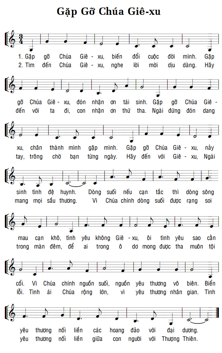 1. Gặp gỡ Chúa Giê-xu, biến đổi cuộc đời mình. Gặp gỡ Chúa Giê-xu, đón nhận ơn tái sinh. Gặp gỡ Chúa Giê-xu, chân thành mình gặp mình. Gặp gỡ Chúa Giê-xu, nảy sinh tình đệ huynh. Dòng suối nếu cạn tắc thì dòng sông mau cạn khô, tình yêu không Giê-xu, ôi tình yêu sao cằn cỗi. Vì Chúa chính nguồn suối, nguồn yêu thương vô biên. Biển yêu thương nối liền các hoang đảo với đại dương. 2. Tìm đến Chúa Giê-xu, nghe lời mời dịu dàng. Hãy đến với ta đi, con nhận ơn thứ tha. Ngài đứng đón dang tay, trông chờ bạn từng ngày. Hãy đến với Giê-xu, Ngài mang mọi sầu thương. Vì Chúa chính dòng suối được rạng soi trong màn đêm, để ai trong ô dơ mong được tha muôn tội lỗi. Tình ái Chúa rộng lớn, vì yêu thương nhân gian. Tình yêu thương nối liền giữa con người với Thượng Thiên.