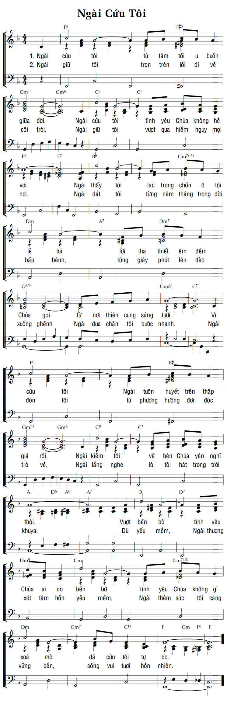 1. Ngài cứu tôi từ tăm tối u buồn giữa đời. Ngài cứu tôi tình yêu Chúa không hề vơi. Ngài thấy tôi lạc trong chốn ô tội, lê loi, lời tha thiết êm đềm. Chúa gọi từ nơi thiên cung sáng tươi. Vì Ngài cứu tôi. Ngài tuôn huyết trên thập giá rồi, Ngài kiếm tôi về bên Chúa yên nghỉ thôi. Vượt bến bờ tình yêu Chúa ai dò bến bờ, tình yêu Chúa không gì xoá mờ đã cứu tôi tự do. 2. Ngài giữ tôi trọn trên lối đi về cõi trời. Ngài giữ tôi vượt qua hiểm nguy mọi nơi. Ngài dắt tôi từng năm tháng trong đời bấp bênh, từng giây phút lên đèo. Ngài đưa chân tôi bước nhanh. Ngài đón tôi từ phương hướng đơn độc trở về, Ngài lắng nghe lời tôi hát trong trời khuya. Dù yếu mềm, Ngài thương xót tâm hồn yếu mềm, Ngài thêm sức tôi càng vững bền, sống vui tươi hồn nhiên.
