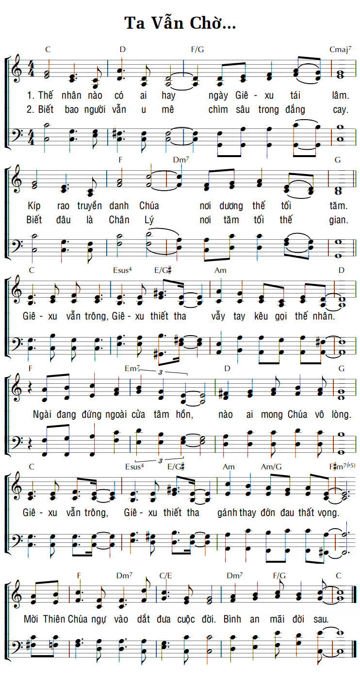 1. Thế nhân nào có ai hay ngày Giê-xu tái lâm. Kíp rao truyền danh Chúa nơi dương thế tối tăm. Giê-xu vẫn trông, Giê-xu thiết tha vẫy tay kêu gọi thế nhân. Ngài đang đứng ngoài cửa tâm hồn, nào ai mong Chúa vô lòng. Giê-xu vẫn trông, Giê-xu thiết tha gánh thay đớn đau thất vọng. Mời Thiên Chúa ngự vào dắt đưa cuộc đời. Bình an mãi đời sau. 2. Biết bao người vẫn u mê chìm sâu trong đắng cay. Biết đâu là Chân Lý nơi tăm tối thế gian. Giê-xu vẫn trông, Giê-xu thiết tha vẫy tay kêu gọi thế nhân. Ngài đang đứng ngoài cửa tâm hồn, nào ai mong Chúa vô lòng. Giê-xu vẫn trông, Giê-xu thiết tha gánh thay đớn đau thất vọng. Mời Thiên Chúa ngự vào dắt đưa cuộc đời. Bình an mãi đời sau.