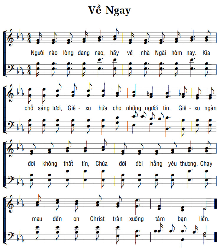 1. Người nào lòng đang nao, hãy về nhà Ngài hôm nay. Kìa chỗ sáng tươi, Giê-xu hứa cho những người tin. Giê-xu ngàn đời không thất tín, Chúa đời đời hằng yêu thương. Chạy mau đến ơn Christ tràn xuống tâm bạn liền.