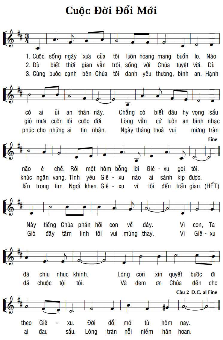 1. Cuộc sống ngày xưa của tôi luôn hoang mang buồn lo. Nào có ai ủi an thân này. Chẳng có biết đâu hy vọng sầu não ê chề. Rồi một hôm bỗng lời Giê-xu gọi tôi. Này tiếng Chúa phán hồi con về đây. Vì con, Ta đã chịu nhục khinh. Lòng con xin quyết bước đi theo Giê-xu. Đời đổi mới từ hôm nay. 2. Dù biết thời gian vẫn trôi, sống với Chúa tuyệt vời. Dù gió mưa cuốn lôi cuộc đời. Lòng vẫn cứ luôn an bình nhạc khúc ngân vang. Tình yêu Giê-xu nào ai sánh kịp được. Giờ đây tâm linh tôi vui mừng thay. Vì Giê-xu đã chuộc tội tôi. Và đem ơn Chúa đến cho ai đau sầu. Lòng tràn nỗi niềm hân hoan. 3. Cùng bước cạnh bên Chúa tôi danh yêu thương, bình an. Hạnh phúc cho những ai tin nhận. Ngày tháng thoả vui mừng tràn lấn trong tim. Ngợi khen Giê-xu vì tôi đến trần gian. (HẾT)