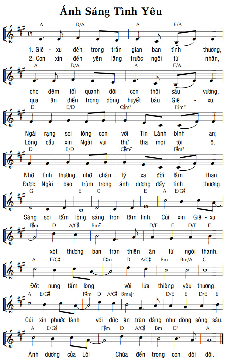 1. Giê-xu đến trong trần gian ban tình thương, cho đêm tối quanh đời con thôi sầu vương. Ngài rạng soi lòng con với Tin Lành bình an; Nhờ tình thương, nhờ chân lý xa đời lầm than. Sáng soi tấm lòng, sáng trọn tâm linh. Cúi xin Giê-xu Đốt nung tấm lòng với lửa thiêng yêu thương. Cúi xin phước lành với đức ân tràn dâng như dòng sông sâu. Ánh dương của Lời Chúa đến trong con đời đời. 2. Con xin đến yên lặng trước ngôi từ nhân, qua ân điển trong dòng huyết báu Giê-xu. Lòng cầu xin Ngài vui thứ tha mọi tội ô. Được Ngài bao trùm trong ánh dương đầy tình thương. xót thương ban tràn thiên ân từ ngôi thánh.