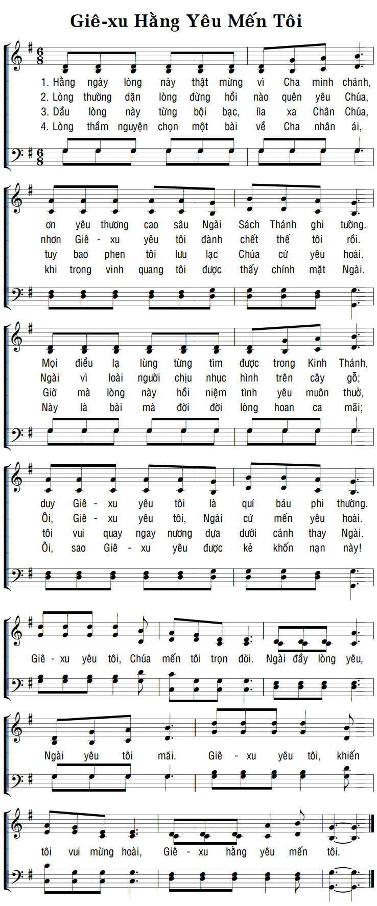 1. Hằng ngày lòng này thật mừng vì Cha minh chánh, ơn yêu thương cao sâu Ngài Sách Thánh ghi tường. Mọi điều lạ lùng từng tìm được trong Kinh Thánh, duy Giê-xu yêu tôi là quí báu phi thường. 2. Lòng thường dặn lòng đừng hồi nào quên yêu Chúa, nhơn Giê-xu yêu tôi đành chết thế tôi rồi. Ngài vì loài người chịu nhục hình trên cây gỗ; Ôi, Giê-xu yêu tôi, Ngài cứ mến yêu hoài. 3. Dầu lòng này từng bội bạc, lìa xa Chân Chúa, tuy bao phen tôi lưu lạc Chúa cứ yêu hoài. Giờ mà lòng này hồi niệm tình yêu muôn thuở, tôi vui quay ngay nương dựa dưới cánh thay Ngài. 4. Lòng thầm nguyện chọn một bài về Cha nhân ái, khi trong vinh quang tôi được thấy chính mặt Ngài. Này là bài mà đời đời lòng hoan ca mãi; Ôi, sao Giê-xu yêu được kẻ khốn nạn này! Điệp khúc: Giê-xu yêu tôi, Chúa mến tôi trọn đời. Ngài đầy lòng yêu, Ngài yêu tôi mãi. Giê-xu yêu tôi, khiến tôi vui mừng hoài, Giê-xu hằng yêu mến tôi.