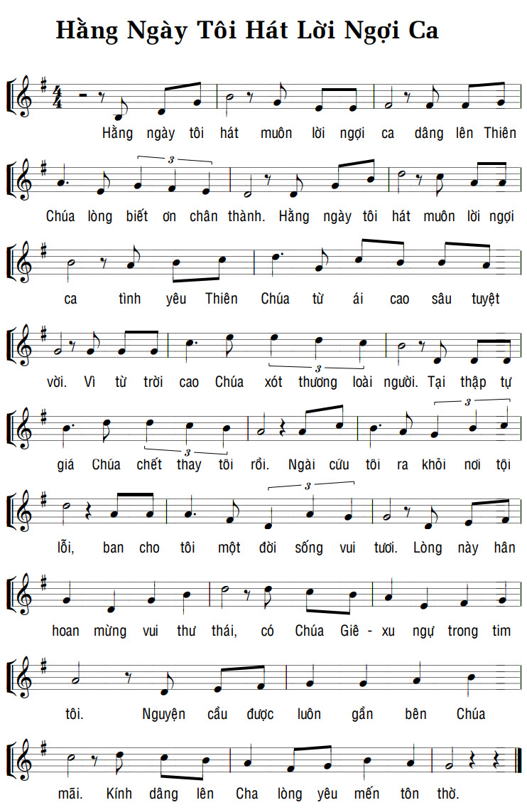 1. Hằng ngày tôi hát muôn lời ngợi ca dâng lên Thiên Chúa lòng biết ơn chân thành. Hằng ngày tôi hát muôn lời ngợi ca tình yêu Thiên Chúa từ ái cao sâu tuyệt vời. Vì từ trời cao Chúa xót thương loài người. Tại thập tự giá Chúa chết thay tôi rồi. Ngài cứu tôi ra khỏi nơi tội lỗi, ban cho tôi một đời sống vui tươi. Lòng này hân hoan mừng vui thư thái, có Chúa Giê-xu ngự trong tim tôi. Nguyện cầu được luôn gần bên Chúa mãi. Kính dâng lên Cha lòng yêu mến tôn thờ.