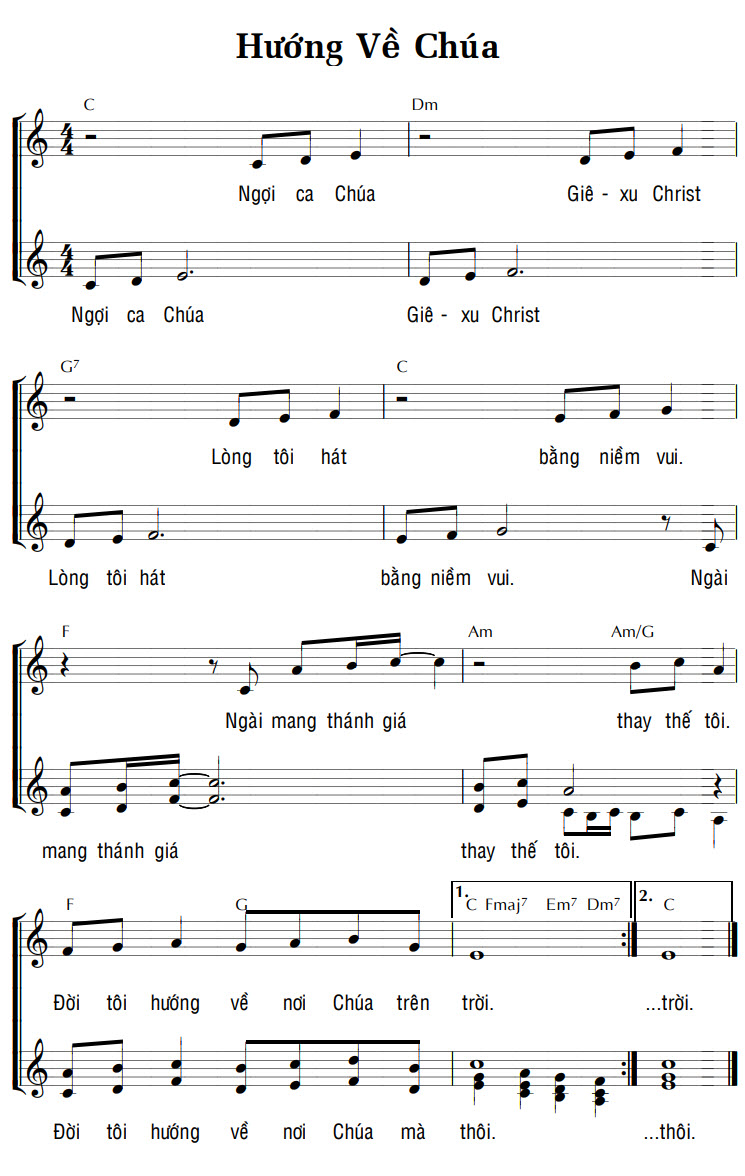 1. Ngợi ca Chúa Giê-xu Christ. Lòng tôi hát bằng niềm vui. Ngài mang thánh giá thay thế tôi. Đời tôi hướng về nơi Chúa trên trời. 2. Ngợi ca Chúa Giê-xu Christ. Lòng tôi hát bằng niềm vui. Ngài mang thánh giá thay thế tôi. Đời tôi hướng về nơi Chúa mà thôi.