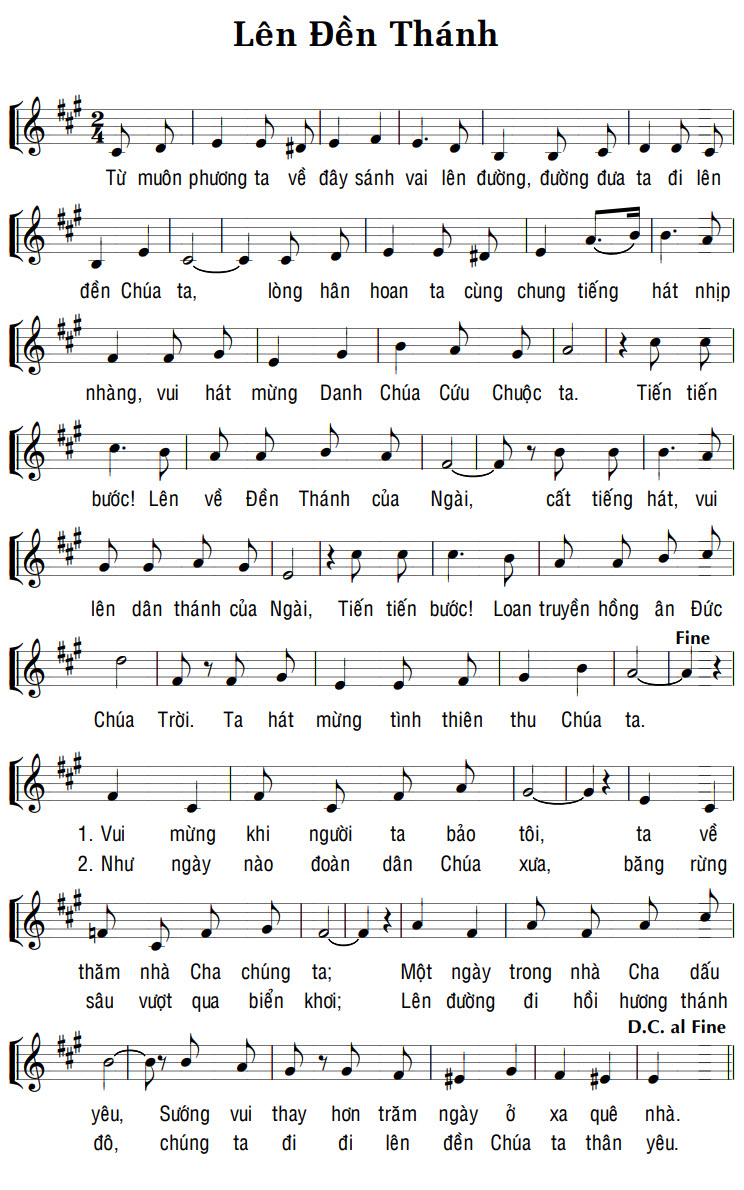 1. Vui mừng khi người ta bảo tôi, ta về thăm nhà Cha chúng ta; Một ngày trong nhà Cha dấu yêu, Sướng vui thay hơn trăm ngày ở xa quê nhà. 2. Như ngày nào đoàn dân Chúa xưa, bằng rừng sâu vượt qua biển khơi; Lên đường đi hồi hương thánh đô, chúng ta đi đi lên đền Chúa ta thân yêu. Điệp khúc: Từ muôn phương ta về đây sánh vai lên đường, đường đưa ta đi lên đền Chúa ta, lòng hân hoan ta cùng chung tiếng hát nhịp nhàng, vui hát mừng Danh Chúa Cứu Chuộc ta. Tiến tiến bước! Lên về Đền Thánh của Ngài, cất tiếng hát, vui lên dân thánh của Ngài, Tiến tiến bước! Loan truyền hồng ân Đức Chúa Trời. Ta hát mừng tình thiên thu Chúa ta.