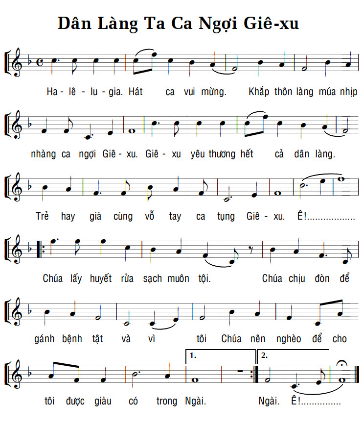 1. Ha-lê-lu-gia. Hát ca vui mừng. Khắp thôn làng múa nhịp nhàng ca ngợi Giê-xu. Giê-xu yêu thương hết cả dân làng. Trẻ hay già cùng vỗ tay ca tụng Giê-xu. Ê! Chúa lấy huyết rửa sạch muôn tội. Chúa chịu đòn để gánh bệnh tật và vì tôi Chúa nên nghèo để cho tôi được giàu có trong Ngài. 2. Ha-lê-lu-gia. Hát ca vui mừng. Khắp thôn làng múa nhịp nhàng ca ngợi Giê-xu. Giê-xu yêu thương hết cả dân làng. Trẻ hay già cùng vỗ tay ca tụng Giê-xu. Ê! Chúa lấy huyết rửa sạch muôn tội. Chúa chịu đòn để gánh bệnh tật và vì tôi Chúa nên nghèo để cho tôi được giàu có trong Ngài. Ê!