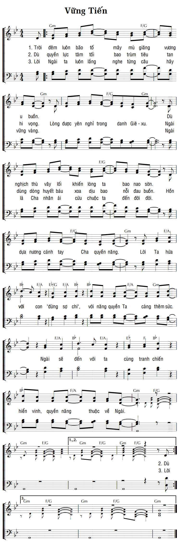 1. Trời đêm luôn bão tố mây mù giăng vương u buồn. Lòng được yên nghỉ trong danh Giê-xu. nghịch thù vây lối khiến lòng ta bao nao sờn. dựa nương cánh tay Cha quyền năng. Lời Ta hứa với con "đừng sợ chi", với năng quyền Ta càng thêm sức. Ngài sẽ đến với ta cùng tranh chiến hiển vinh, quyền năng thuộc về Ngài. 2. Dù quyền lực tăm tối bao trùm tiêu tan hi vọng. Dù Ngài nghịch thù vây lối dùng dòng huyết báu xoa dịu bao nỗi đau buồn. dựa nương cánh tay Cha quyền năng. Lời Ta hứa với con "đừng sợ chi", với năng quyền Ta càng thêm sức. Ngài sẽ đến với ta cùng tranh chiến hiển vinh, quyền năng thuộc về Ngài. 3. Lời Ngài ta luôn lắng nghe từng câu hãy vững vàng. Ngài nghịch thù vây lối là Cha nhân ái cứu chuộc ta đến đời đời. Hồn dựa nương cánh tay Cha quyền năng. Lời Ta hứa với con "đừng sợ chi", với năng quyền Ta càng thêm sức. Ngài sẽ đến với ta cùng tranh chiến hiển vinh, quyền năng thuộc về Ngài.