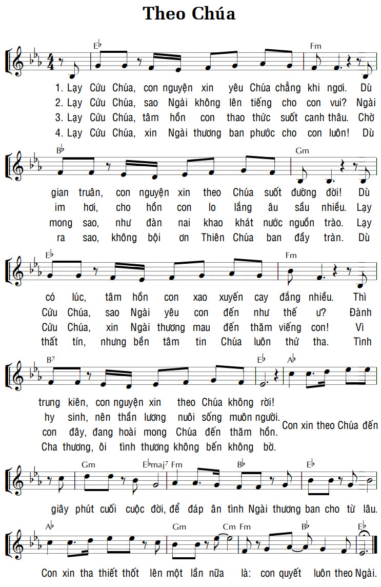 1. Lạy Cứu Chúa, con nguyện xin yêu Chúa chẳng khi ngơi. Dù gian truân, con nguyện xin theo Chúa suốt đường đời! Dù có lúc, tâm hồn con xao xuyến cay đắng nhiều. Thì trung kiên, con nguyện xin theo Chúa không rời! 2. Lạy Cứu Chúa, sao Ngài không lên tiếng cho con vui? Ngài im hơi, cho hồn con lo lắng âu sầu nhiều. Lạy Cứu Chúa, sao Ngài yêu con đến như thế ư? Đành hy sinh, nên thần lương nuôi sống muôn người. 3. Lạy Cứu Chúa, tâm hồn con thao thức suốt canh thâu. Chờ mong sao, như đàn nai khao khát nước nguồn trào. Lạy Cứu Chúa, xin Ngài thương mau đến thăm viếng con! Vì con đây, đang hoài mong Chúa đến thăm hồn. 4. Lạy Cứu Chúa, xin Ngài thương ban phước cho con luôn! Dù ra sao, không bội ơn Thiên Chúa ban đầy tràn. Dù thất tín, nhưng bền tâm tin Chúa luôn thứ tha. Tình Cha thương, ôi tình thương không bến không bờ. Điệp khúc: giây phút cuối cuộc đời, để đáp ân tình Ngài thương ban cho từ lâu. Con xin tha thiết thốt lên một lần nữa là: con quyết luôn theo Ngài.