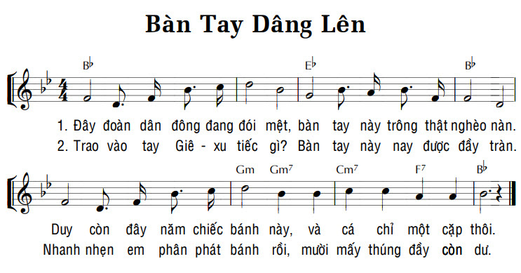 1. Đây đoàn dân đông đang đói mệt, bàn tay này trông thật nghèo nàn. Duy còn đây năm chiếc bánh này, và cá chỉ một cặp thôi. 2. Trao vào tay Giê - xu tiếc gì? Bàn tay này nay được đầy tràn. Nhanh nhẹn em phân phát bánh rồi, mười mấy thúng đầy còn dư.