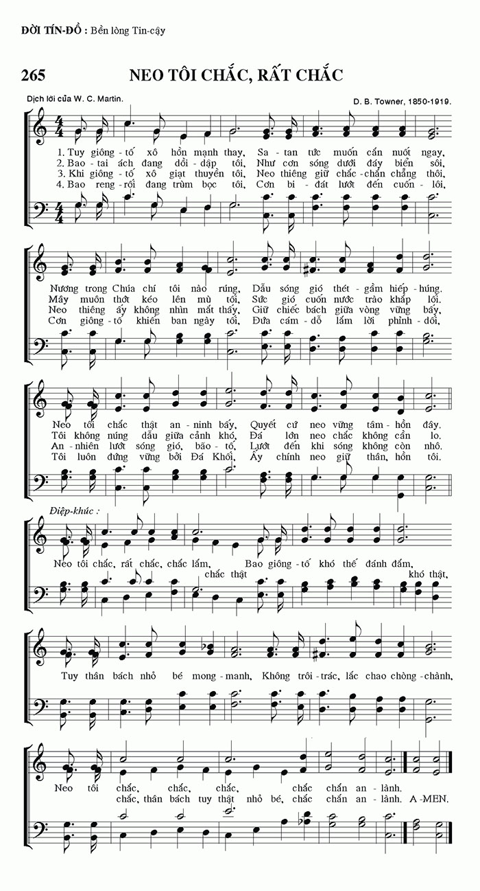1. Tuy giông - tố xô hồn mạnh thay, Sa tan tức muốn cắn nuốt ngay, Nương trong Chúa chí tôi nào rúng, Dẫu sóng gió thét gầm hiếp - húng. Neo tôi chắc thật an - ninh bấy, Quyết cứ neo vững tâm - hồn đây. 2. Bao tai ách đang dồi - dập tôi, Như cơn sóng dưới đáy biển sôi, Mây muốn thốt kéo lên mù tối, Sức gió cuốn nước trào khắp lối. Tôi không núng dẫu giữa cảnh khó, Đá lớn neo chắc không cần lo. 3. Khi giông - tố xô giạt thuyền tôi, Neo thiêng giữ chắc - chắn chẳng thôi, Neo thiêng ấy không nhìn mắt thấy, Giữ chiếc bách giữa vòng vững bấy, An - nhiên lướt sóng gió, bão - tố, Lướt đến khi sóng không còn nhô. 4. Bao reng rối đang trùm bọc tôi, Cơn bi - đát lướt đến cuốn lôi, Cơn giông - tố khiến ban ngày tối, Đứa cám - dỗ lắm lời phỉnh - dổi, Tôi luôn đứng vững bởi Đá Khối, Ấy chính neo giữ thân, hồn tôi. Điệp khúc: Neo tôi chắc, rất chắc, chắc lắm, Bao giông tố khó thế đánh đấm, khó thật, chắc thật. Tuy thân bách nhỏ bé mong manh, Không trôi trác, lắc chao chòng - chành, Neo tôi chắc, chắc, chắc, chắc chắc chắn an lành. chắc, thân bách tuy thật nhỏ bé, chắc chắn an lành. A-MEN.