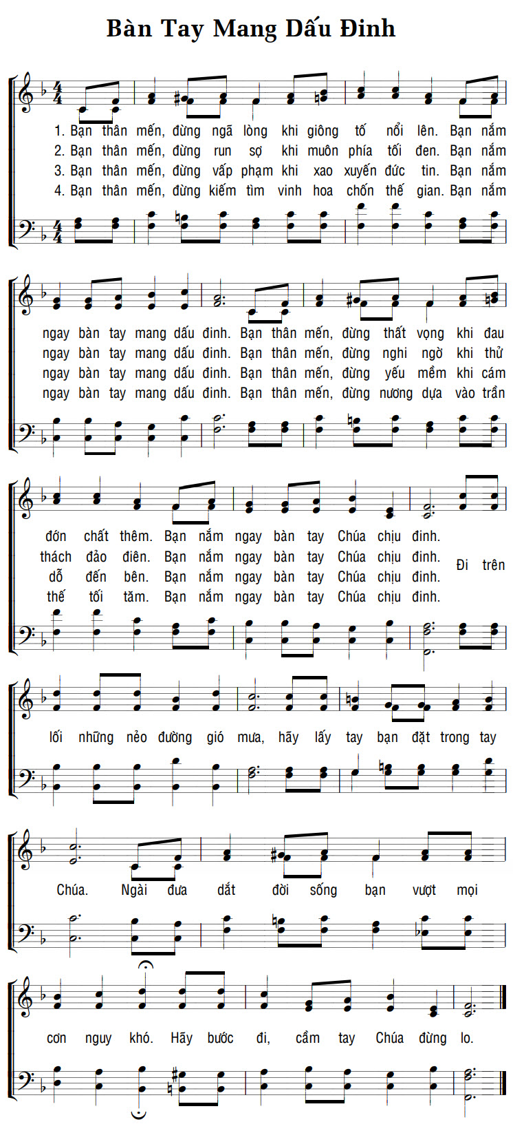 1. Bạn thân mến, đừng ngã lòng khi giông tố nổi lên. Bạn nắm ngay bàn tay mang dấu đinh. Bạn thân mến, đừng thất vọng khi đau đớn chất thêm. Bạn nắm ngay bàn tay Chúa chịu đinh. Đi trên lối những nẻo đường gió mưa, hãy lấy tay bạn đặt trong tay Chúa. Ngài đưa dắt đời sống bạn vượt mọi cơn nguy khó. Hãy bước đi, cầm tay Chúa đừng lo. 2. Bạn thân mến, đừng run sợ khi muôn phía tối đen. Bạn nắm ngay bàn tay mang dấu đinh. Bạn thân mến, đừng nghi ngờ khi thử thách đảo điên. Bạn nắm ngay bàn tay Chúa chịu đinh. Đi trên lối những nẻo đường gió mưa, hãy lấy tay bạn đặt trong tay Chúa. Ngài đưa dắt đời sống bạn vượt mọi cơn nguy khó. Hãy bước đi, cầm tay Chúa đừng lo. 3. Bạn thân mến, đừng vấp phạm khi xao xuyến đức tin. Bạn nắm ngay bàn tay mang dấu đinh. Bạn thân mến, đừng yếu mềm khi cám dỗ đến bên. Bạn nắm ngay bàn tay Chúa chịu đinh. Đi trên lối những nẻo đường gió mưa, hãy lấy tay bạn đặt trong tay Chúa. Ngài đưa dắt đời sống bạn vượt mọi cơn nguy khó. Hãy bước đi, cầm tay Chúa đừng lo. 4. Bạn thân mến, đừng kiếm tìm vinh hoa chốn thế gian. Bạn nắm ngay bàn tay mang dấu đinh. Bạn thân mến, đừng nương dựa vào trần thế tối tăm. Bạn nắm ngay bàn tay Chúa chịu đinh. Đi trên lối những nẻo đường gió mưa, hãy lấy tay bạn đặt trong tay Chúa. Ngài đưa dắt đời sống bạn vượt mọi cơn nguy khó. Hãy bước đi, cầm tay Chúa đừng lo.