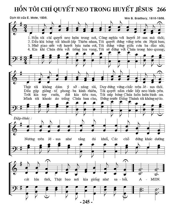 1. Hồn tôi chỉ quyết neo luôn trong nơi, Công nghĩa với huyết Jê-sus mà thôi; Thật tôi không dám ỷ sở năng tôi, Duy đứng vững chắc trên Jê-sus thôi. 2. Dầu khi bóng tối khuất lấp Thiên nhan, Tôi quyết đứng vững trên ơn Ngài ban; Dầu gặp giông tố phong ba kinh thiên, Tôi quyết nắm chắc lấy neo bình yên. 3. Nhờ giao ước với huyết báu tuôn rơi, Tôi đứng vững giữa cơn ba-đào sôi; Trời kia tuy cuốn, đất kia tiêu tan, Tôi núp bóng Chúa luôn luôn bình-an. 4. Kìa khi Chúa đến với tiếng loa vang, Tôi sẽ đứng với Chúa trong hào quang; Mình tôi khoác áo trắng Chúa ban cho, Đứng trước Đấng Thánh tôi không sợ-lo. Điệp khúc: Nương trên Jê-sus như tảng đá khối, Các chỗ đứng khác dường cát lún thôi, Thật bao nơi kia giống như sa bồi. A-MEN.