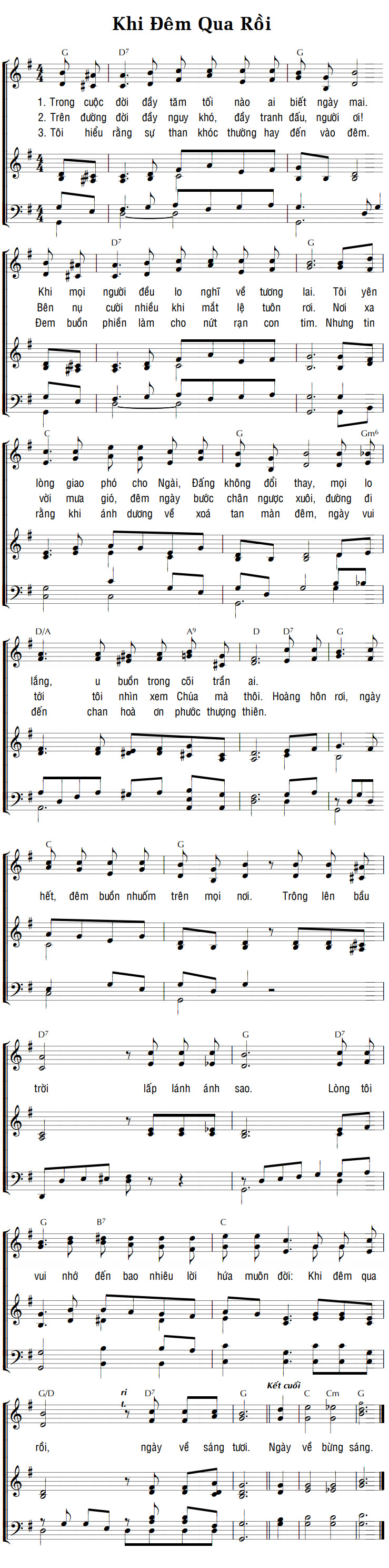 1. Trong cuộc đời đầy tăm tối nào ai biết ngày mai. Khi mọi người đều lo nghĩ về tương lai. Tôi yên lòng giao phó cho Ngài, Đấng không đổi thay, mọi lo lắng, u buồn trong cõi trần ai. Hoàng hôn rơi, ngày hết, đêm buồn nhuốm trên mọi nơi. Trông lên bầu trời lấp lánh ánh sao. Lòng tôi vui nhớ đến bao nhiêu lời hứa muôn đời: Khi đêm qua rồi, ngày về sáng tươi. 2. Trên đường đời đầy nguy khó, đầy tranh đấu, người ơi! Bên nụ cười nhiều khi mắt lệ tuôn rơi. Nơi xa vời mưa gió, đêm ngày bước chân ngược xuôi, đường đi tới tôi nhìn xem Chúa mà thôi. Hoàng hôn rơi, ngày hết, đêm buồn nhuốm trên mọi nơi. Trông lên bầu trời lấp lánh ánh sao. Lòng tôi vui nhớ đến bao nhiêu lời hứa muôn đời: Khi đêm qua rồi, ngày về sáng tươi. 3. Tôi hiểu rằng sự than khóc thường hay đến vào đêm. Đem buồn phiền làm cho nứt rạn con tim. Nhưng tin rằng khi ánh dương về xoá tan màn đêm, ngày vui đến chan hoà ơn phước thượng thiên. Hoàng hôn rơi, ngày hết, đêm buồn nhuốm trên mọi nơi. Trông lên bầu trời lấp lánh ánh sao. Lòng tôi vui nhớ đến bao nhiêu lời hứa muôn đời: Khi đêm qua rồi, ngày về sáng tươi. Điệp khúc: Ngày về bừng sáng.