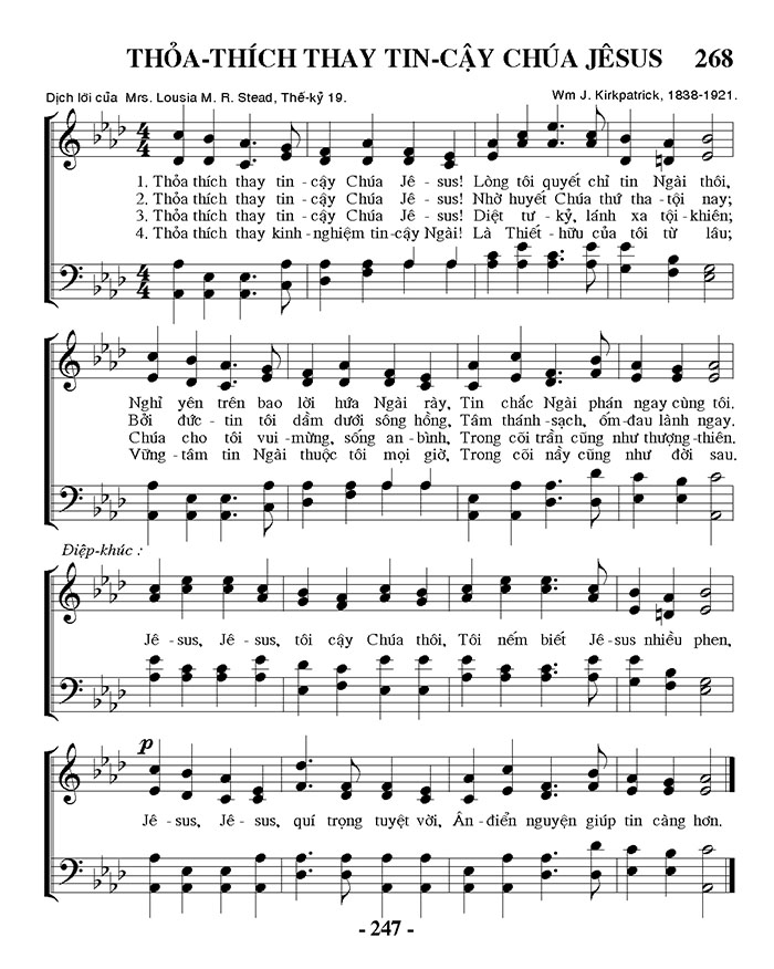 1. Thỏa thích thay tin cậy Chúa Jêsus! Lòng tôi quyết chỉ tin Ngài thôi, Nghỉ yên trên bao lời hứa Ngài rày, Tin chắc Ngài phán ngay cùng tôi. 2. Thỏa thích thay tin cậy Chúa Jêsus! Nhờ huyết Chúa thứ tha tội nay; Bởi đức tin tôi dầm dưới sông hồng, Tâm thánh sạch, ốm đau lành ngay. 3. Thỏa thích thay tin cậy Chúa Jêsus! Diệt tư kỷ, lánh xa tội khiên; Chúa cho tôi vui mừng, sống an bình, Trong cõi trần cũng như thượng thiên. 4. Thỏa thích thay kinh nghiệm tin cậy Ngài! Là Thiết hữu của tôi từ lâu; Vững tâm tin Ngài thuộc tôi mọi giờ, Trong cõi nầy cũng như đời sau. Điệp khúc: Jêsus, Jêsus, tôi cậy Chúa thôi, Tôi nếm biết Jêsus nhiều phen, Jêsus, Jêsus, quí trọng tuyệt vời, Ân điển nguyện giúp tin càng hơn.