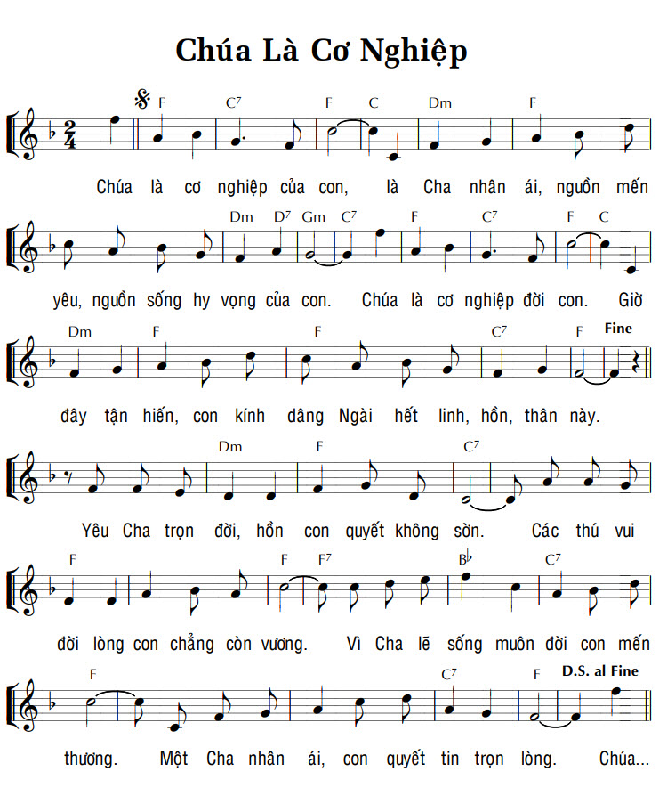 1. Chúa là cơ nghiệp của con, là Cha nhân ái, nguồn mến yêu, nguồn sống hy vọng của con. Chúa là cơ nghiệp đời con. Giờ đây tận hiến, con kính dâng Ngài hết linh, hồn, thân này. Yêu Cha trọn đời, hồn con quyết không sờn. Các thú vui đời lòng con chẳng còn vương. Vì Cha lẽ sống muôn đời con mến thương. Một Cha nhân ái, con quyết tin trọn lòng. Chúa...