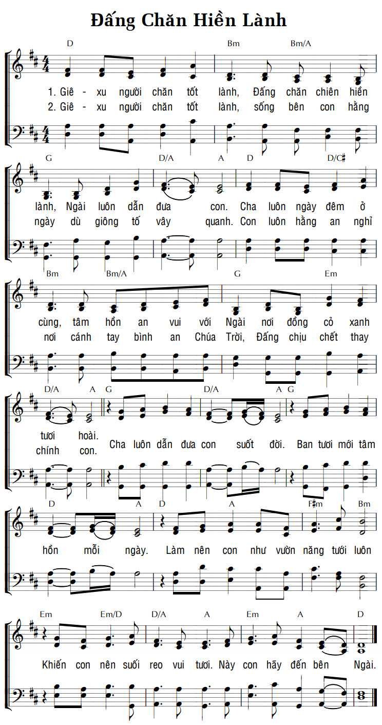 1. Giê-xu người chăn tốt lành, Đấng chăn chiên hiền lành, Ngài luôn dẫn đưa con. Cha luôn ngày đêm ở cùng, tâm hồn an vui với Ngài nơi đồng cỏ xanh tươi hoài. Cha luôn dẫn đưa con suốt đời. Ban tươi mới tâm hồn mỗi ngày. Làm nên con như vườn năng tưới luôn. Khiến con nên suối reo vui tươi. Này con hãy đến bên Ngài. 2. Giê-xu người chăn tốt lành, sống bên con hằng ngày dù giông tố vây quanh. Con luôn hằng an nghỉ nơi cánh tay bình an Chúa Trời, Đấng chịu chết thay chính con. Cha luôn dẫn đưa con suốt đời. Ban tươi mới tâm hồn mỗi ngày. Làm nên con như vườn năng tưới luôn. Khiến con nên suối reo vui tươi. Này con hãy đến bên Ngài.