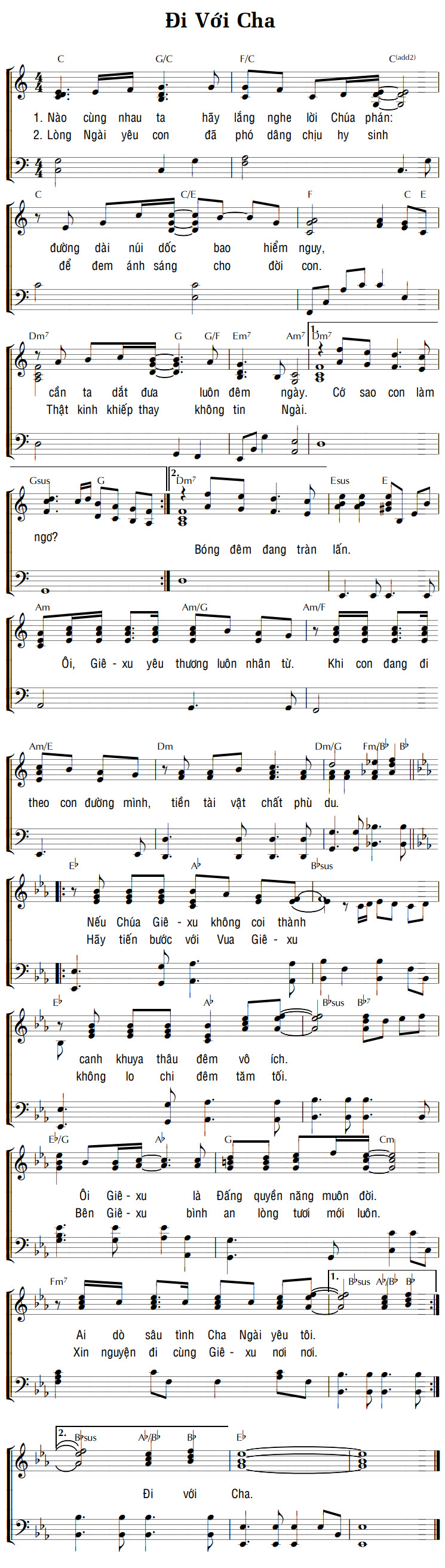 1. Nào cùng nhau ta hãy lắng nghe lời Chúa phán: đường dài núi dốc bao hiểm nguy, cần ta dắt đưa luôn đêm ngày. Cớ sao con làm ngo? Ôi, Giê-xu yêu thương luôn nhân từ. Khi con đang đi theo con đường mình, tiền tài vật chất phù du. Nếu Chúa Giê-xu không coi thành canh khuya thâu đêm vô ích. Ôi Giê-xu là Đấng quyền năng muôn đời. Ai dò sâu tình Cha Ngài yêu tôi. 2. Lòng Ngài yêu con đã phó dâng chịu hy sinh để đem ánh sáng cho đời con. Thật kinh khiếp thay không tin Ngài. Bóng đêm đang tràn lấn. Hãy tiến bước với Vua Giê-xu không lo chi đêm tăm tối. Bên Giê-xu bình an lòng tươi mới luôn. Xin nguyện đi cùng Giê-xu nơi nơi. Điệp khúc: Đi Với Cha.